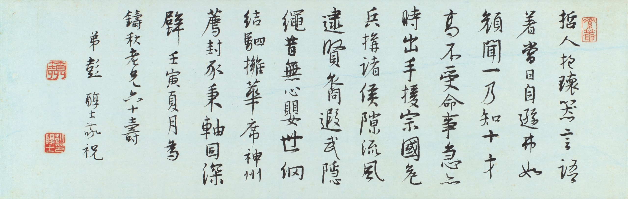 哲人抱懷器,言語著當日,自遜弗如顏,聞一乃知十,才高不受命,事急亦時出,手援宗國危,兵搆諸侯隙,流風逮賢裔,遐武隱繩昔,無心嬰世綱,結駟擁華席,神州薦封豕,秉軸固深壁。壬寅夏月寫,鑄秋老兄六十壽,弟彭醇士敬祝。