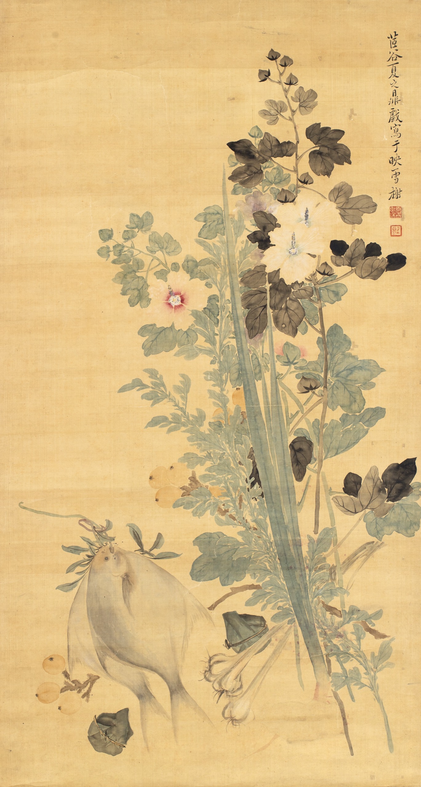 首頁 拍品總覽 2025秋季 share Lot. 3290 夏之鼎Shia Jr-Ding 1782-1827 午瑞圖 NT$ 50,000-80,000RMB¥ 10,000-16,000HK$ 12,500-20,000 媒材/尺寸 立軸 設色 紙本, 124x66cm 款識 茝谷夏之鼎戲寫于映雪榭。 出版/備註 台北資深藏家舊藏 賞析 註:夏之鼎,[清](1782-1827)字禹庭,號茝谷,言其居所曰雪鴨巢、映雪榭,吳縣(今江蘇蘇州)人。工書、畫,初從昆山唐香樵(和春)遊,凡作寫意花卉禽鳥。說明:蒲草葉、石榴花和蜀葵花,畫中尚有枇杷和鯧魚,幾個粽子散落一旁。圖中的粽子、蒲草等物暗示此畫是傳統節日端午節。 登記競投 返回拍品列表 拍品推薦 3075 林順雄 馬 預估價:NT$ 50,000-80,000 2025秋季 3080 溥心畬 懷戒臺寺古松 預估價:NT$ 2,000,000-3,000,000 2025秋季 3332 季康 芭蕉仕女 預估價:NT$ 20,000-30,000 2025秋季 3303 高泉性潡 隱元禪師像贊 預估價:NT$ 110,000-150,000 2025秋季 3198 任伯年 花蔭小犬 預估價:NT$ 300,000-500,000 2025秋季 3247 周澄 煙翠高閣圖 預估價:NT$ 30,000-50,000 2025秋季 3324 王農 關外人 預估價:NT$ 15,000-25,000 2025秋季 3174 呂萬、譚澤闓 溪山春靄/行楷 成扇 預估價:NT$ 30,000-50,000 2025秋季 3219 歐豪年 鹿群 預估價:NT$ 20,000-40,000 2025秋季 3203 倪墨耕 粉櫻雙喜 預估價:NT$ 10,000-40,000 2025秋季