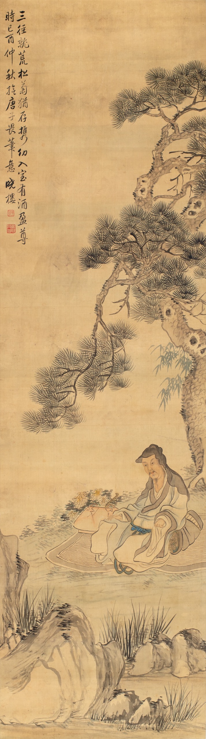 三徑就荒,松菊猶存,擕幼入室,有酒盈尊。時已酉仲秋撫唐子畏筆意。曉樓。