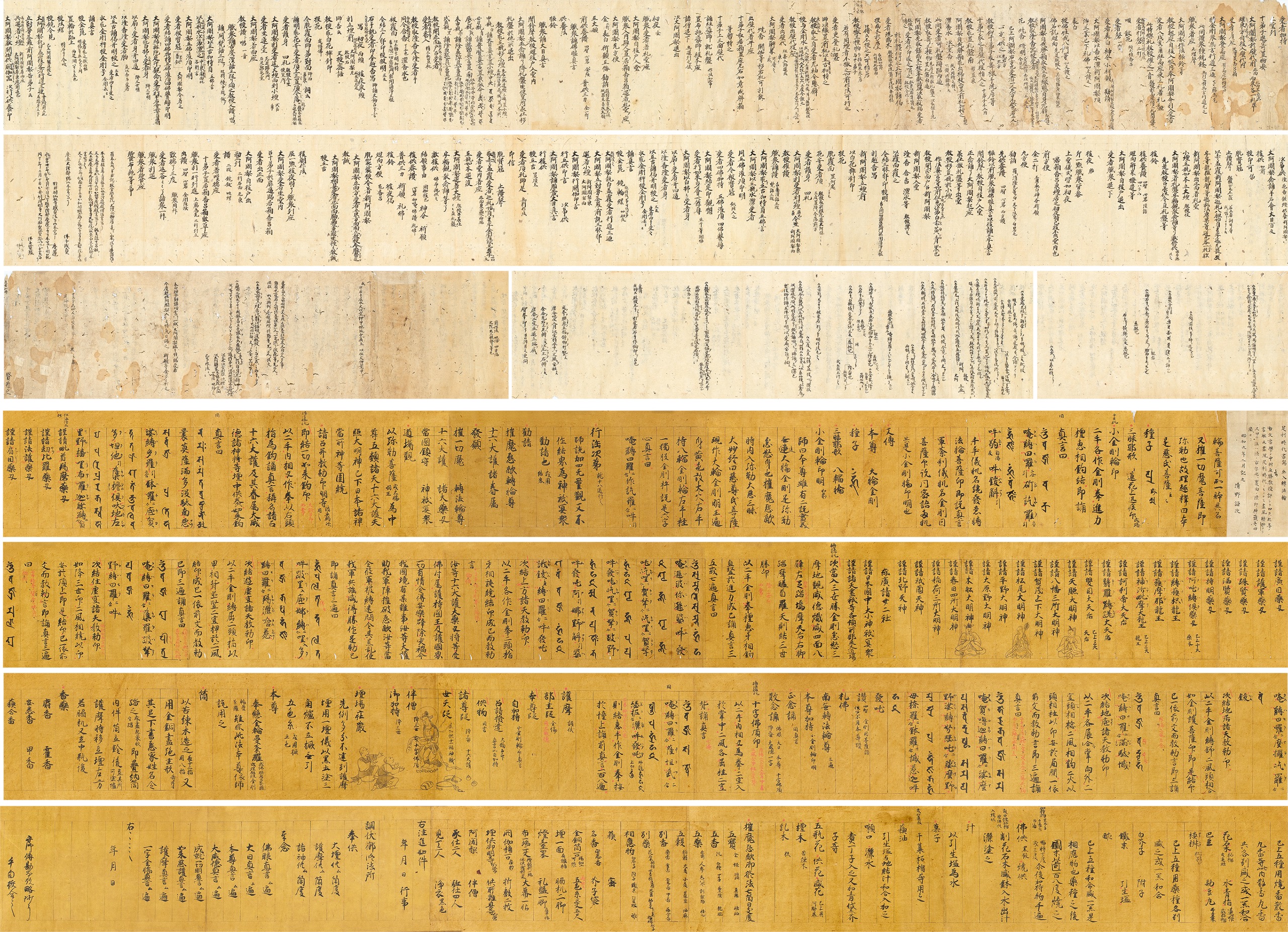 受者加持 上堂列十弟子進寄置物具 大阿闍梨於壁代前(正面)西東(礼兩界意也)各一礼畢 迴東方自㣪入壁代內 受者著座 從僧置箱呂箱 大阿闍梨登高座 有高座加持作法 持金剛衆無言行道三迎 下□為光 此間讚衆撞鐃鉢 無列之時無言行道无之。(後面釋文略)足利時代書寫 画入轉法輪右文書學,中村直勝教授評□□曰□此卷,書躰及畫風足利時代,□,畫風輕妙□□又曰□八法,右字也、裏面,捺印神護寺旧藏。昭和九年二月記之,清野謙次。(後面釋文略)