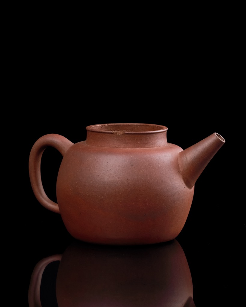 本壺壺形樸實端莊,體量飽滿圓厚,腹部渾圓,下承圈足,比例勻稱。短流直出,壺口與流嘴呈一直線,為典型直流式造型。壺身未施刻飾,通體僅見紫砂原礦質感,呈自然紅棕色澤,胎質細密,砂粒隱見。耳把圓潤飽實,轉折自然,呼應整體造型之渾厚古雅。