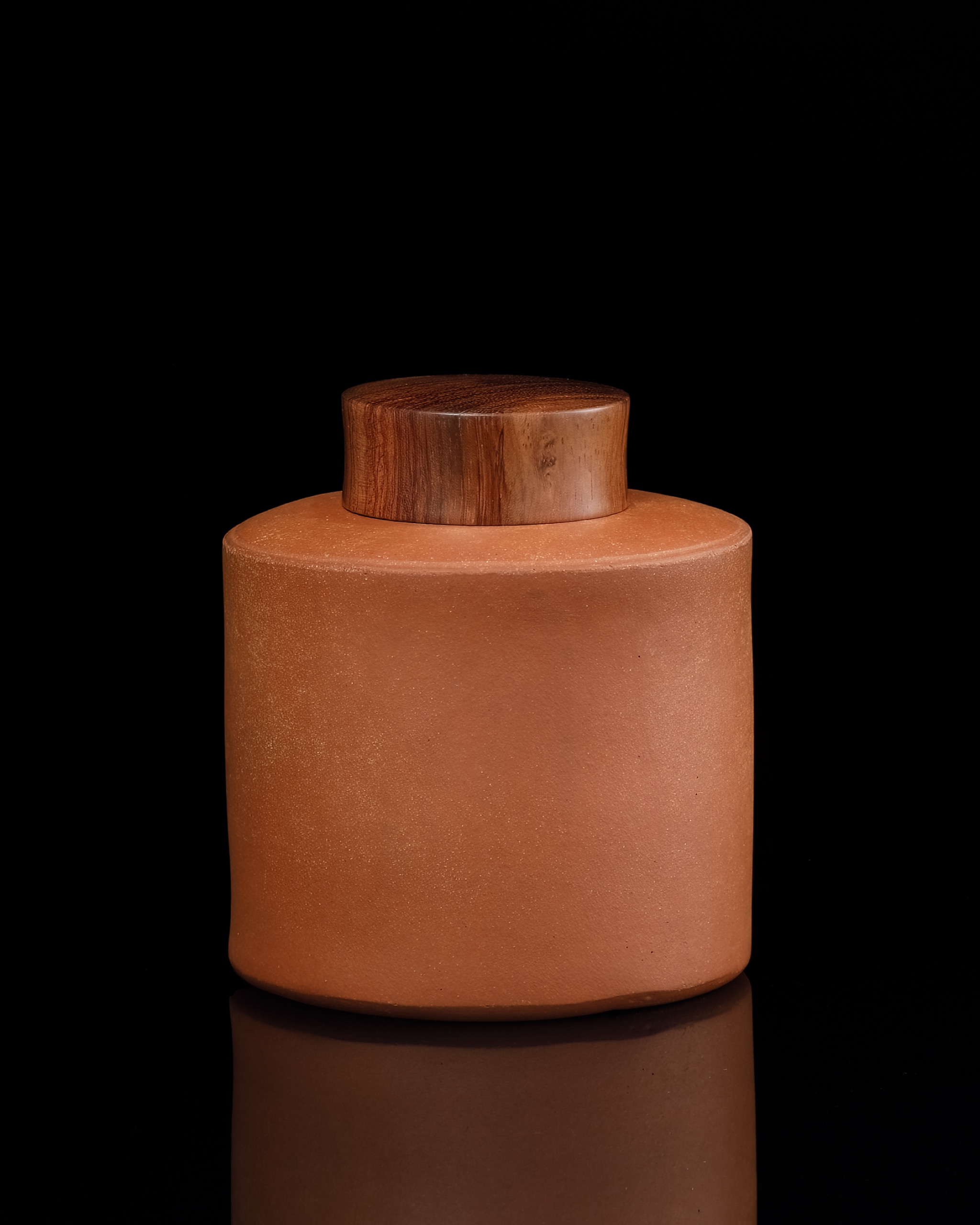 茶罐造型呈圓柱式,口沿略微外撇,罐身上下寬幅一致,線條簡約挺拔,重心穩定。質為紫泥調桂花砂,色呈紅橙中帶黃,細砂隱現其中,肌理細膩溫潤,散發出含蓄內斂、耐人玩味之書齋情調。