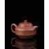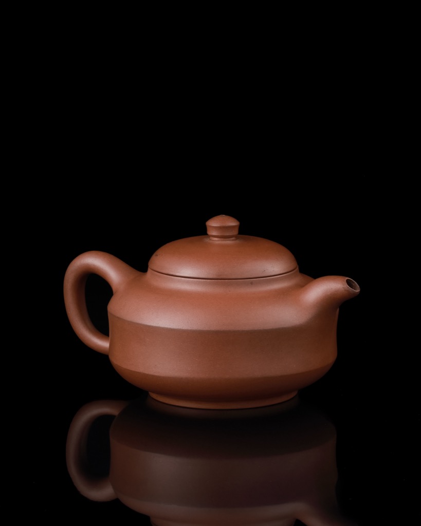 此壺形制扁圓,蓋面微拱,蓋鈕呈截帽狀,與整體造型呼應。壺肩平緩外展,腹部圓潤低伏,底略內斂,重心穩定,線條勻稱柔和,呈現沉著內斂之姿。嘴短而微翹,出水爽利;柄為圓弧形大耳把,握持舒適,造型簡約而不失韻致。