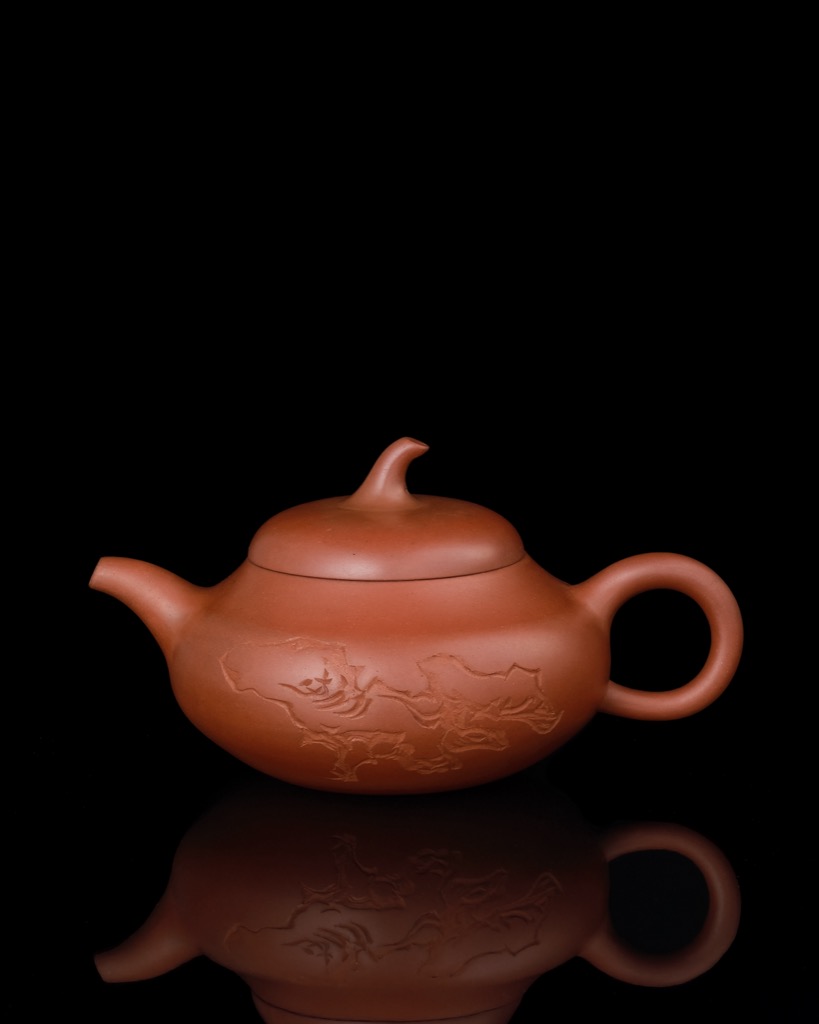 此壺身線條圓潤飽滿,造型穩重大方,壺蓋與壺肩自然過渡,蓋頂微翹若亭亭君子,取「漢君」之名頗得其意。壺嘴直出流利,壺把圓弧回收,比例協調,整體設計兼具實用與美感。壺身一側刻有雅石,線條寫意生動,富文人氣息。