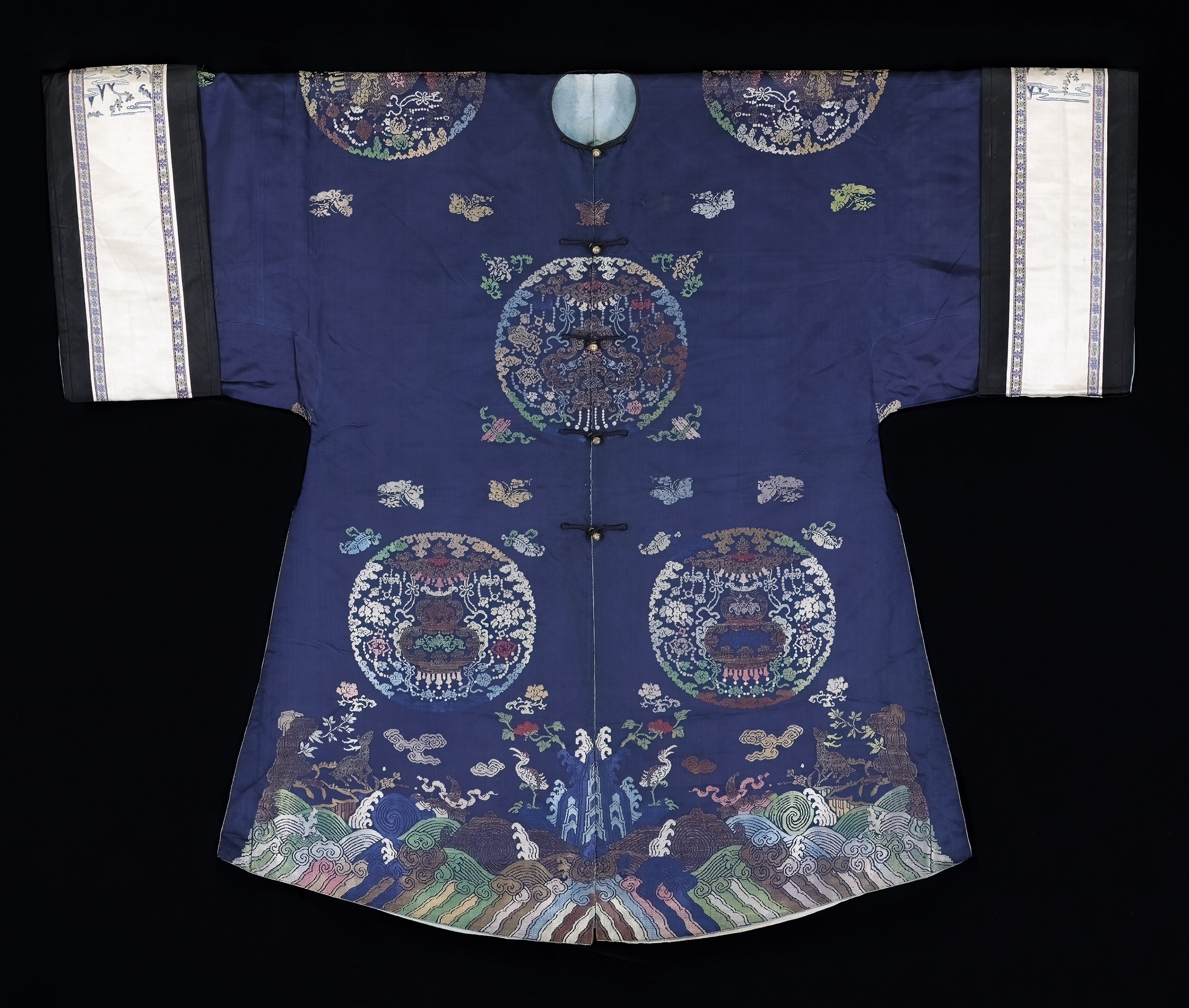 本件華袍為清代宗室與王府女性,包括公主、郡主、福晉與格格等,在壽誕、婚禮、歲節及筵宴等喜慶場合所常著之吉服。袍身以藍緞為地,對襟直開,圓領寬袖,兩側開衩,形制端莊嚴整。