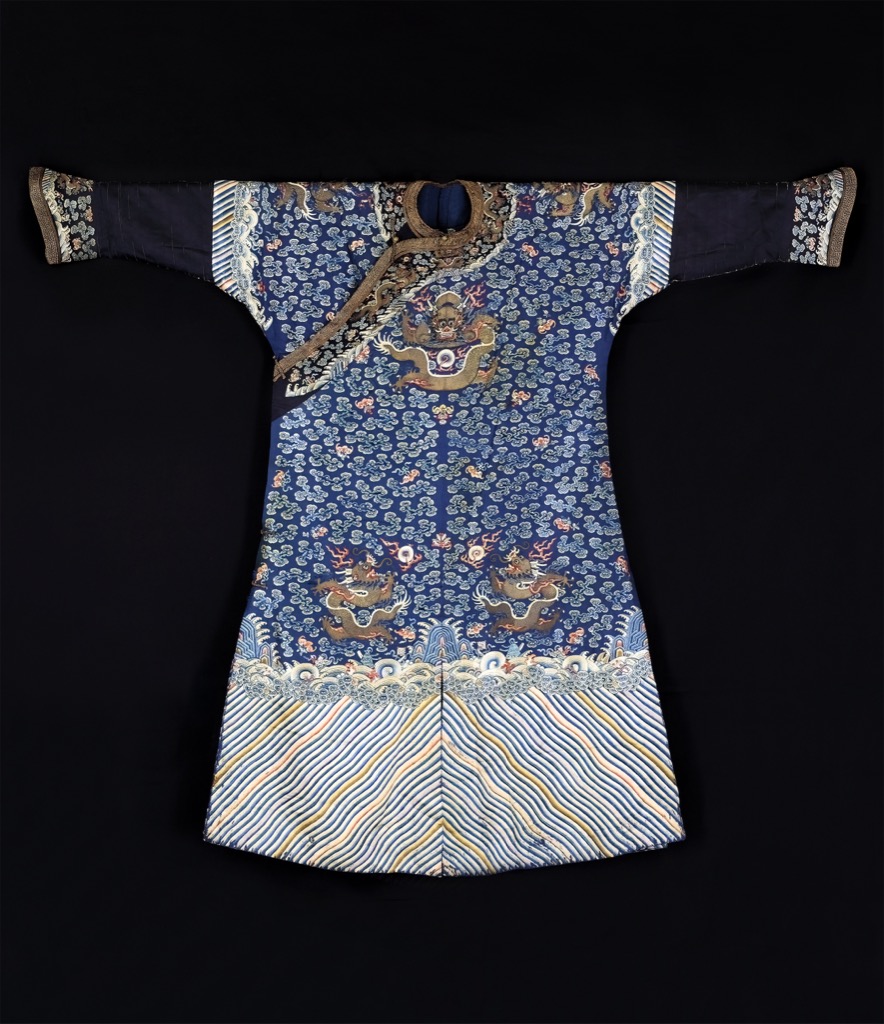 袍身以深藍緞地為基,綴以金線與多彩絲線錦繡紋飾。通體繡飾五爪正龍與行龍,或側身飛騰,或正面盤旋,神態威猛雄健,龍首高昂,鬚鬣飄揚,鱗甲以金線勾勒層疊,氣勢非凡,盡顯皇家威儀。衣身佈滿如意雲頭,間飾鴻蝠、壽桃、卐字符等吉祥圖案,寓意福壽綿長、萬福咸臻,符應皇族對福祿壽康之祥瑞寄望。