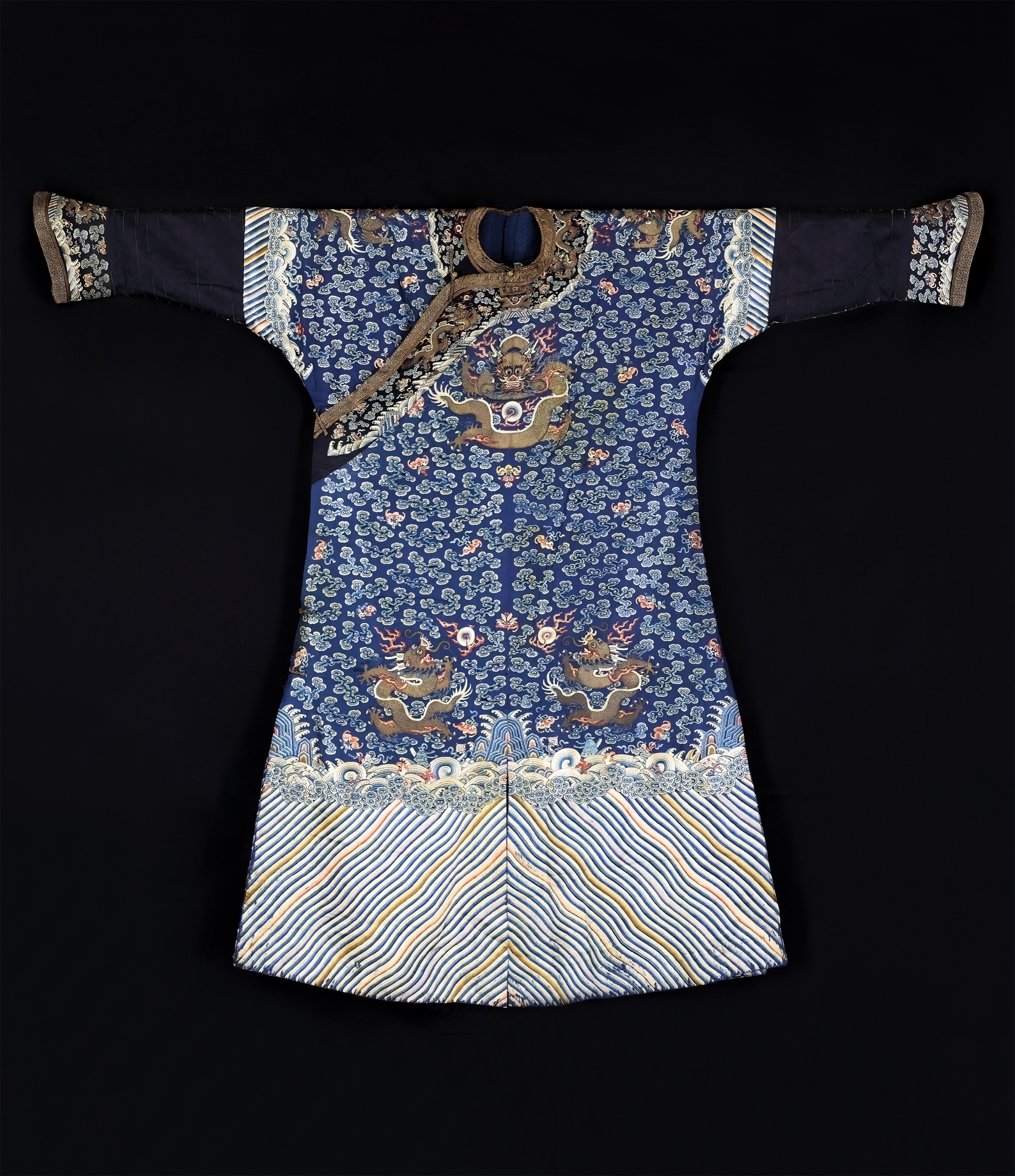 袍下襬飾以「海水江崖」為主題,波濤翻湧之中托起層巒山石,間繡戟磬、卐字、珊瑚等雜寶,象徵萬象承載、福運齊臻。最下緣繡以五色立水,條紋自下而上輻射排列,色彩鮮明,層次遞進,寓意五方正色、澤被四海。全袍構圖嚴謹,針法多變,絲光流轉,金彩交映,工藝華麗精湛,氣韻典雅恢宏。