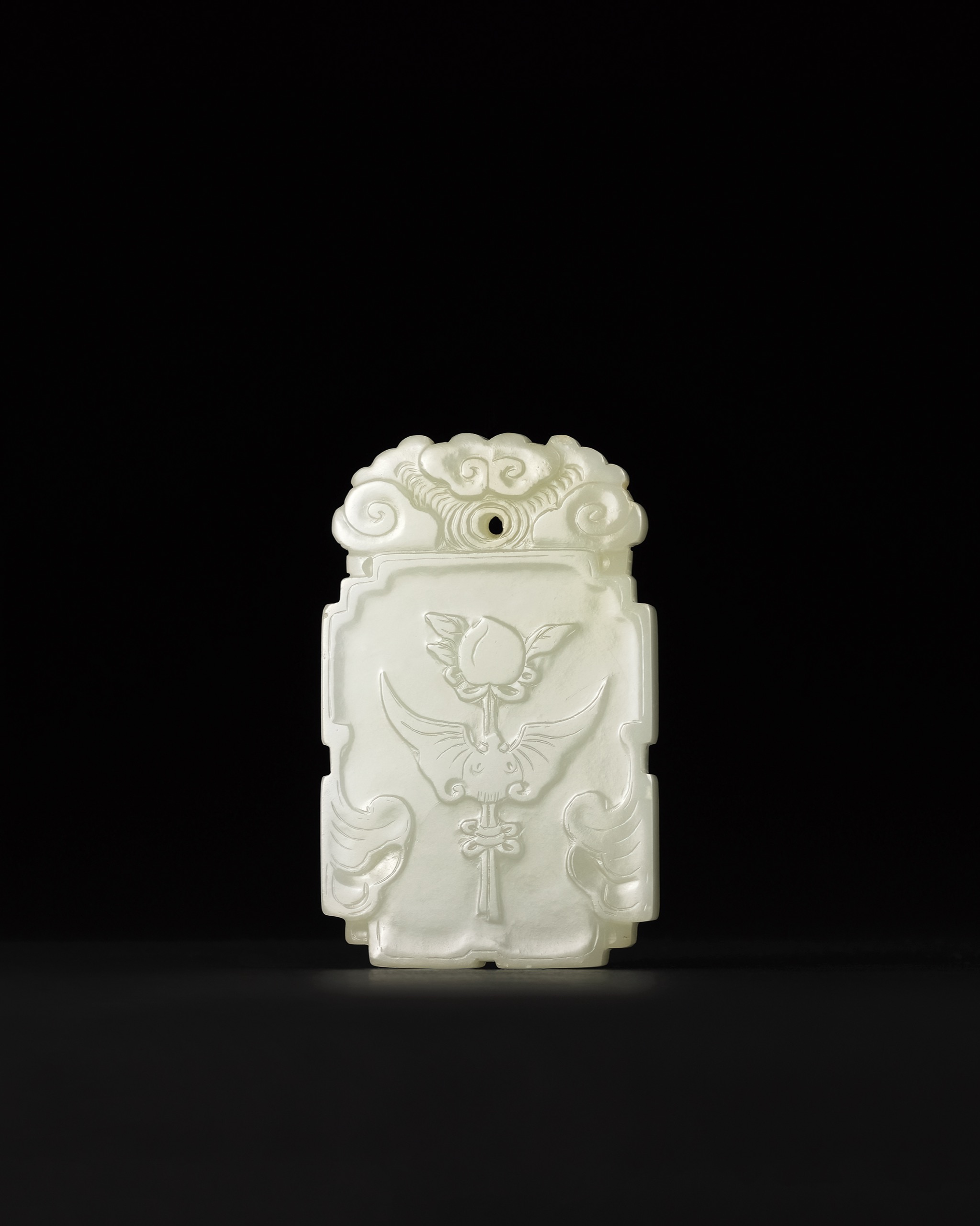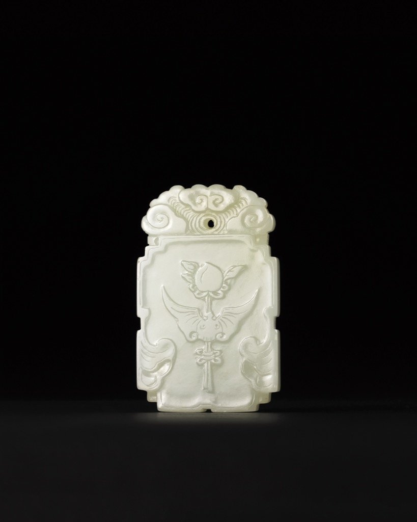 白玉佩牌,玉質潔白細潤,泛微青之澤,溫潤凝潔。器形方整,邊角圓婉,上端鏤雕如意雲紋,氣韻端雅。牌面淺浮雕壽桃與蝙蝠,桃實豐碩,蝠形展翼承桃,構圖靈動,寓「福壽雙全」之意。