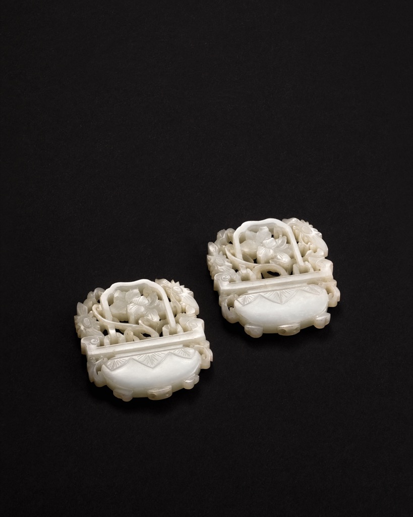 這對清代白玉鏤雕佩飾以籃花為主題,玉質瑩潔細膩,色澤清潤柔和,溫潤可親。構圖採鏤雕與浮雕結合之技法,於花籃中雕飾盛放牡丹與各式繁花,枝葉交錯,層次分明,線條婉轉流暢,形象栩栩如生。花籃紋飾寓「花開富貴」,為傳統吉祥主題,象徵榮華昌盛與富貴綿延。佩件大小對稱,製作精緻,成對保存尤為難得。