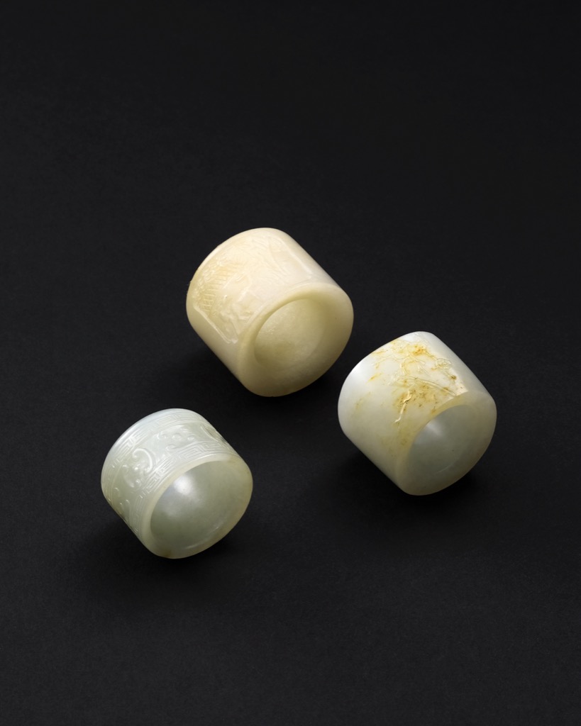 白玉扳指三件,玉質細膩溫潤,器形端正飽滿,圓潤厚重,古雅端凝。其中一件飾勾雲紋,線條流暢;一件保留黃皮,浮雕喜鵲登梅,寓「喜上眉梢」之意,三者各具特色。