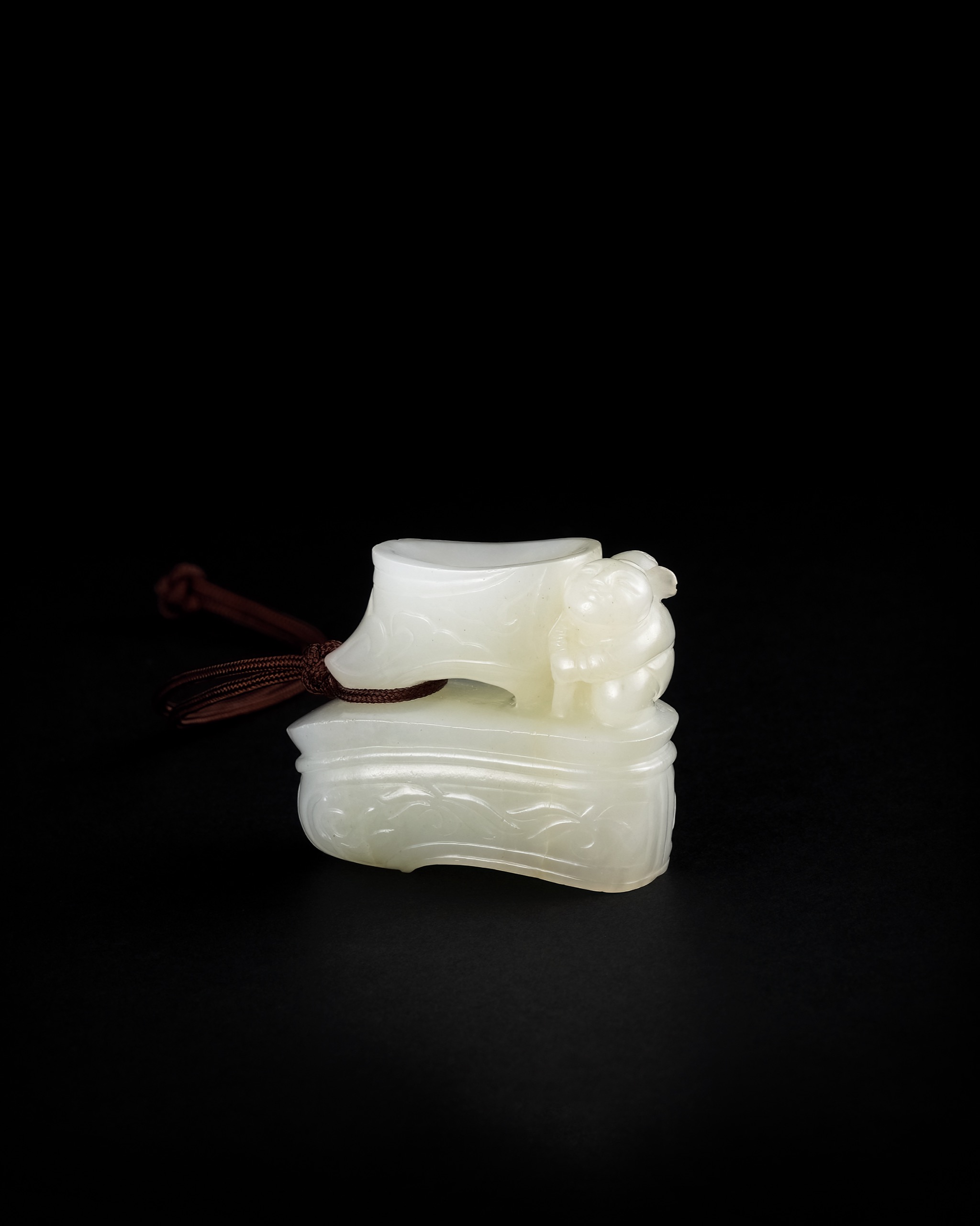 這件「清 白玉白頭偕老墜」選用溫潤潔白之和闐白玉雕製,質地細膩,光澤內斂柔和。作品構思巧妙,以一對古代男女小鞋相疊而成,女鞋上雕飾一童子,神情生動,栩栩如生,取「鞋」諧音「偕」,寓意夫妻「白頭偕老」。