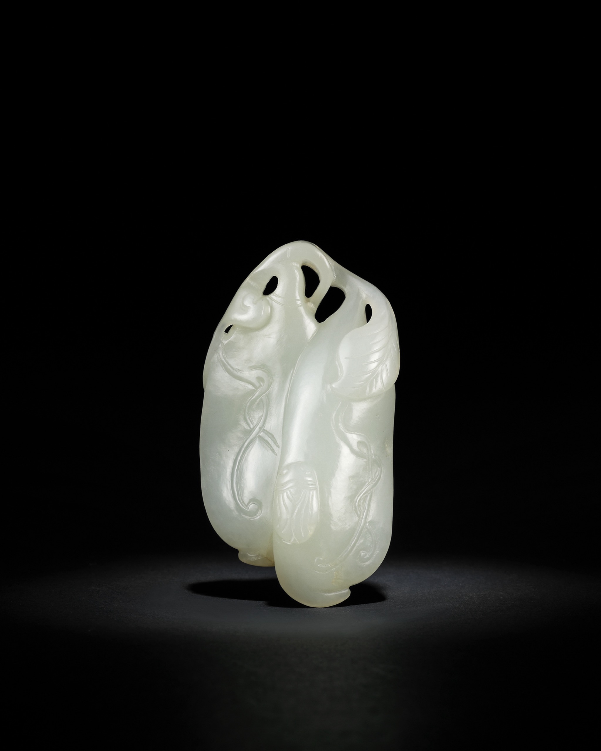 玉珮質地瑩潤細膩,晶潔凝脂,光澤內斂。器形呈雙莢交錯之姿,玉莢表面陰刻藤蔓葉脈,線條流轉自然,刻劃生動寫實。莢端巧雕一蟬,形象靈動,雙翼貼身,脈絡分明,足爪緊扣莢背,藏中寓顯。