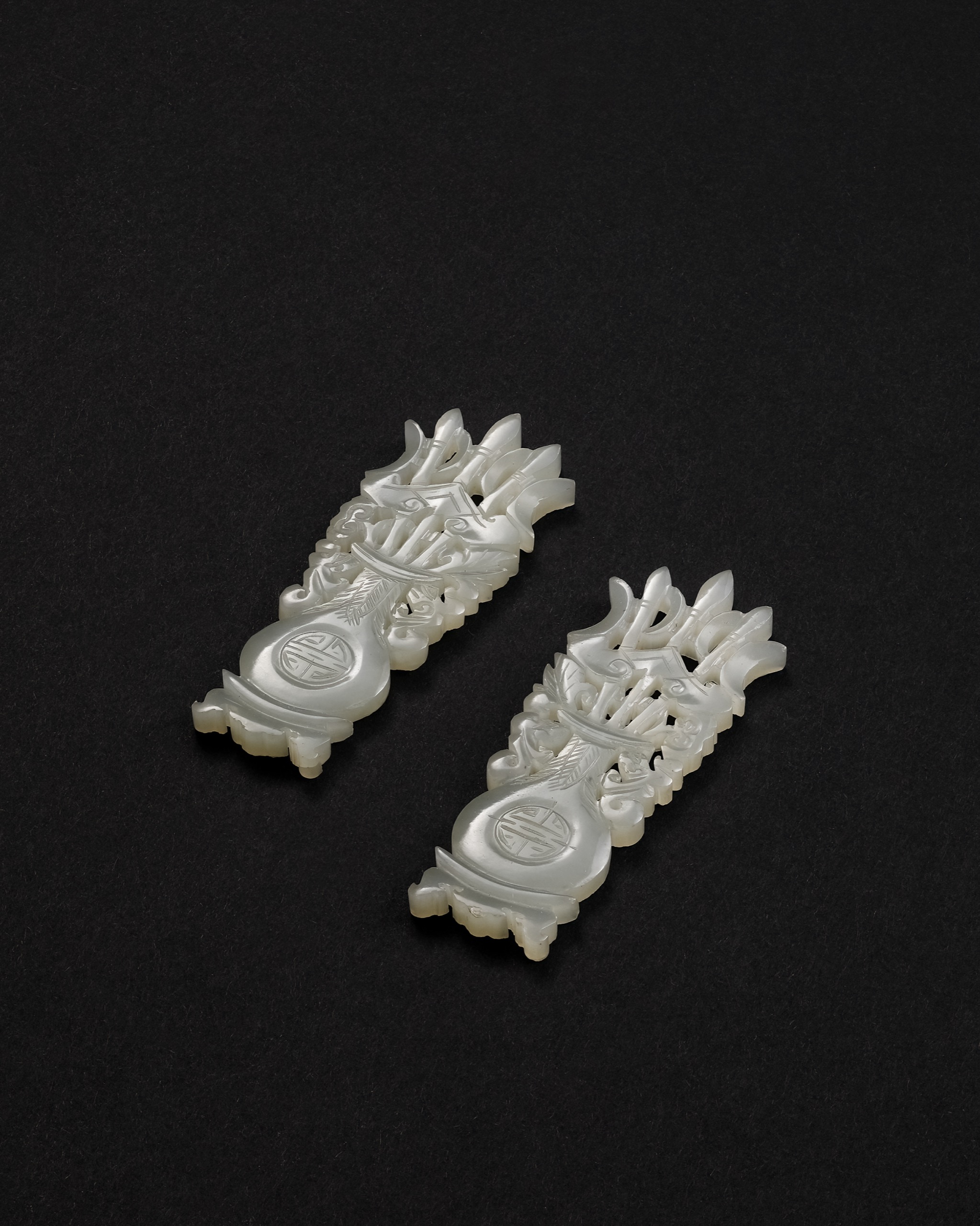 白玉花片,玉質瑩潔,通體採鏤雕技法,層次井然。花瓶端立,瓶中三戟挺然直昇,玉中花瓶取「瓶」與「平」之諧音,戟者古代兵器,為將之象,三戟共昇,寓「平升三級」之吉意,象徵仕途通達、功名步步高陞。