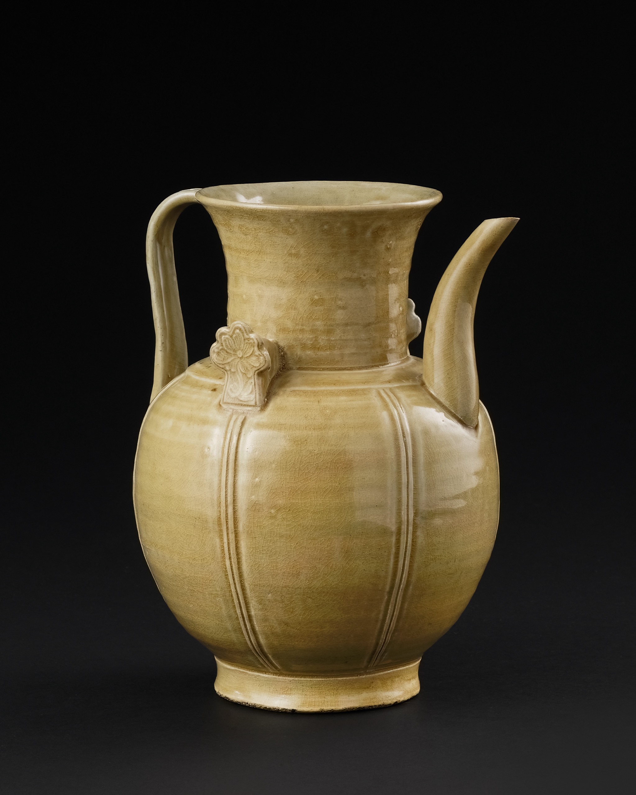 本件執壺舊藏於東京浦上蒼穹堂,由浦上滿先生創立於1979年,專營中、日、韓古陶瓷藝術。浦上氏早年師承繭山龍泉堂,學養深厚,其經營理念嚴謹審慎,藏品皆精。1994年東京國立博物館舉辦「中國陶瓷展」,浦上蒼穹堂即協助出借四十二件重要文物,包括三件國寶與三十件重要文化財,彰顯其學術地位與藏品水準。此五代/北宋越窰黃釉執壺,即為其典藏之一,風格典雅古樸,體現其一貫高標準之收藏取向與對東亞陶瓷藝術之深刻品味。
