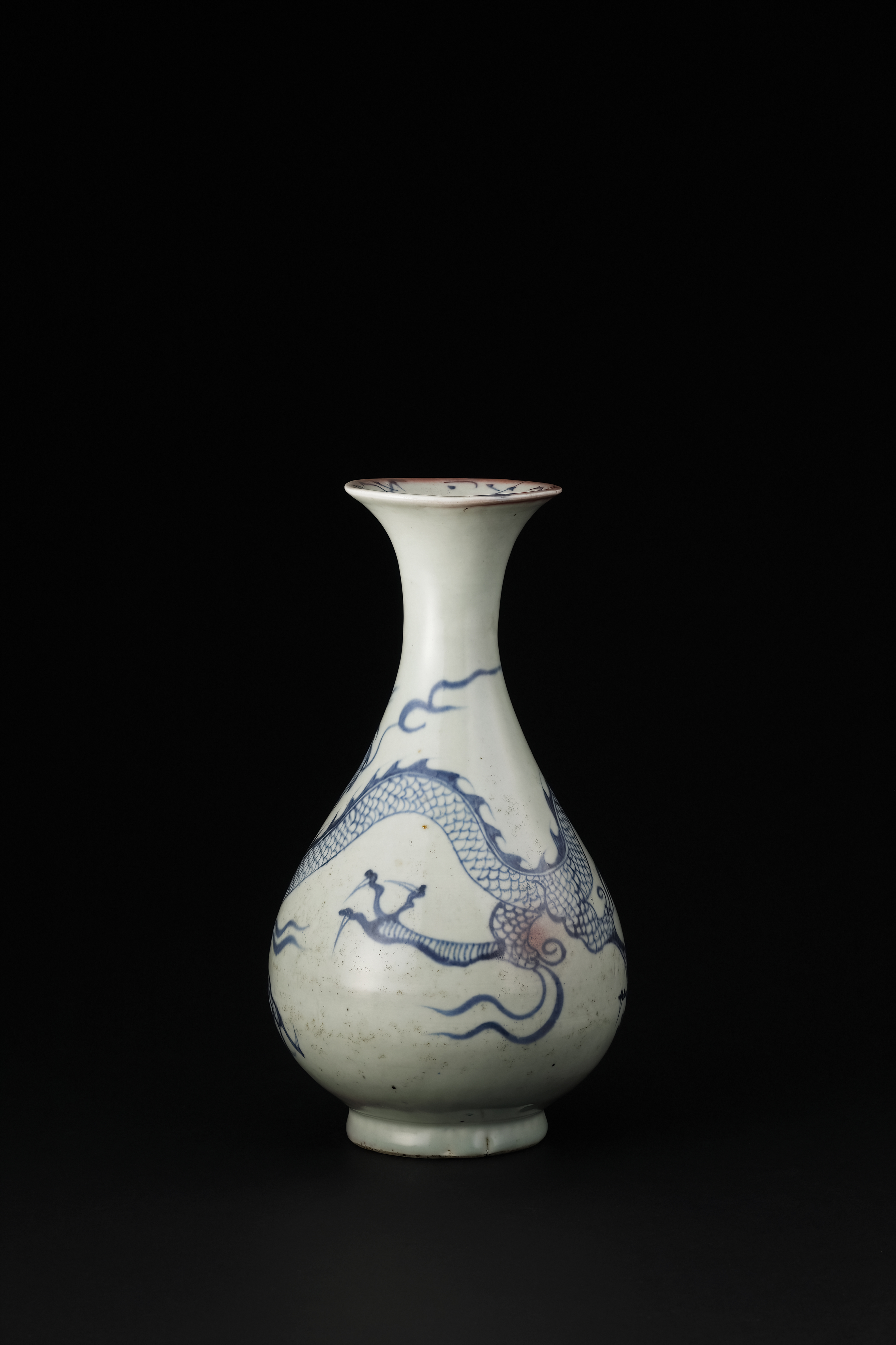 所用青花料疑為進口之蘇麻離青,發色層次分明,深處濃藍近黑,局部呈現鐵鏽斑狀斑點,淡處則泛淡灰藍,如水墨暈染,與龍紋之姿態相得益彰。瓶口與肩部若干區域可見紅釉痕跡,或為偶然點施銅釉於高溫中燒融所致,呈現淡淡釉裏紅效果,與青花色彩交織,增添視覺層次與特殊性,亦映照元代對釉下彩結合之早期探索。