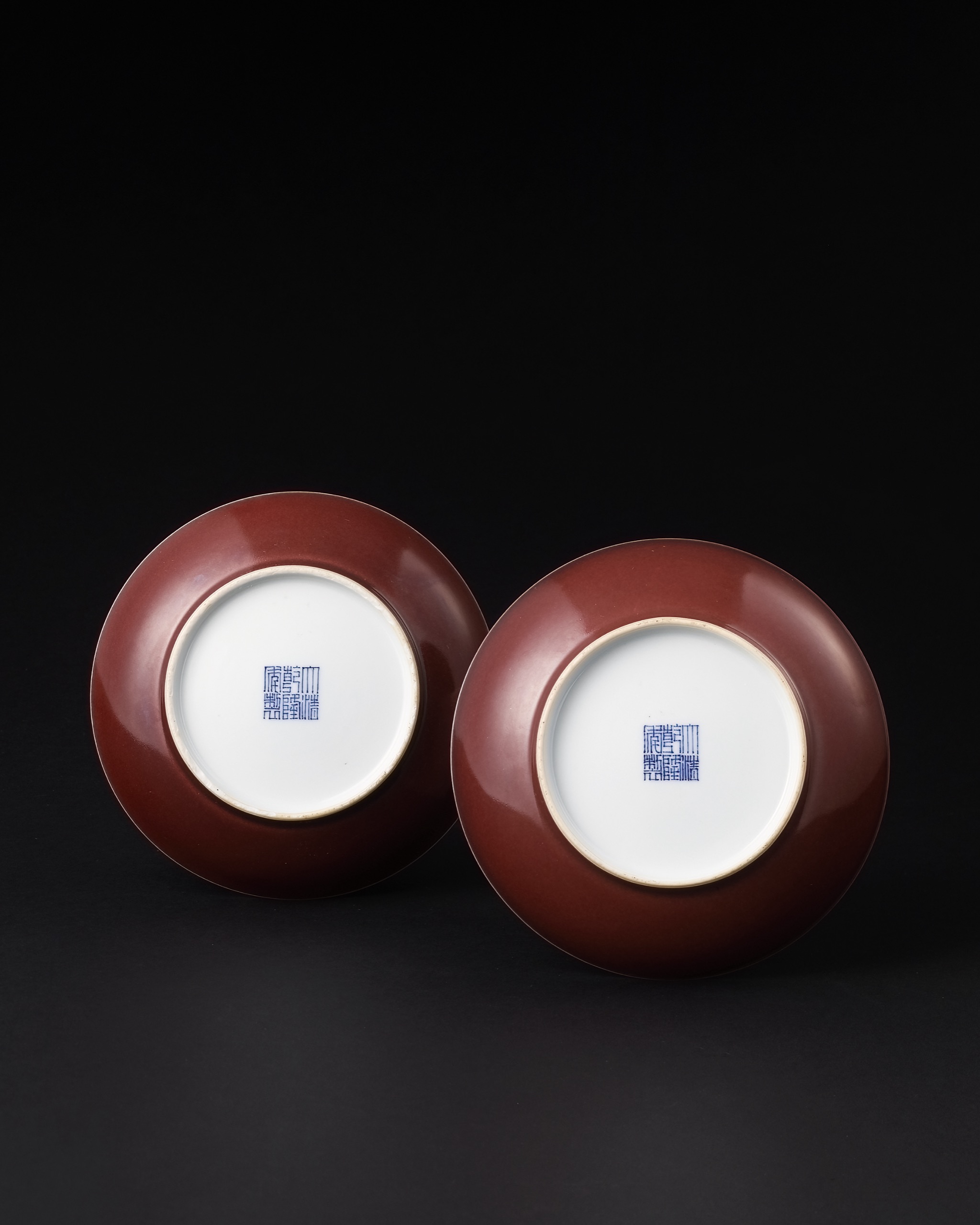 此對清乾隆霽紅釉盤,形制端正,敞口淺腹,底承圈足,結構勻稱,比例收放得宜。盤心與盤內皆施白釉,釉質溫潤凝潔,釉面平整細密,微泛潤光;盤外周身通體施以霽紅釉,色澤沉穩雅勻,施釉均勻。盤底心施青花書「大清乾隆年製」篆書款,筆畫勻稱清晰,發色青翠,款字書寫工整,為乾隆朝典型官款式樣。