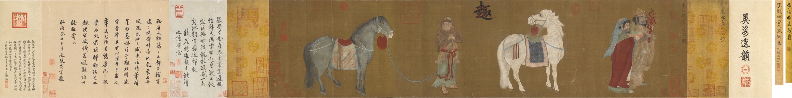 初唐人物藹藹,王都益擅,豈瀛之選。當時臺閣氣象,名士風流無此之盛。李伯時筆精墨妙藝稱珍,予觀此圖,追宗曹韓,具有心思,至於番人牽馬,尤極其態。展玩之暇,覺衣冠肅穆,驊騮俊逸,如覩漢官威儀爰綴數語以誌雅賞。弘治癸丑三月延陵吳寬題