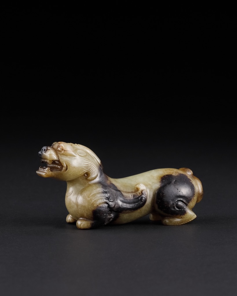 辟邪以青白玉雕成,局部有褐黑色沁斑,色彩豐富,古韻十足。辟邪作伏臥、蓄勢待發姿態,雙目圓睜,張口露齒,神態警覺。肩負長翼,四肢收伏,尾部內卷,整體造型承襲漢制,古拙之中見張力,頗具護祟辟邪之意涵。