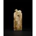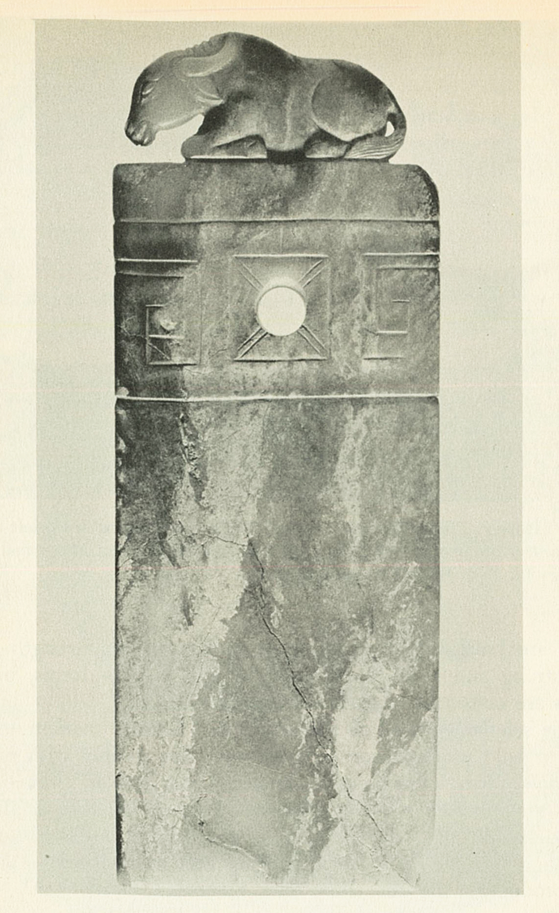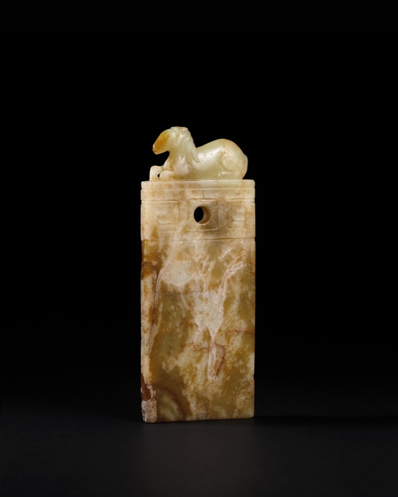 此件明代玉雕馬鈕牌,以青玉琢製,玉色褐黃交雜,斑駁自然。玉牌牌頂雕一伏臥馬形鈕,四肢收腹,昂首回望,體態舒展自然,鬃尾順勢披垂,輪廓圓潤,刻劃簡練中見精微,中央鏤孔,便於懸掛佩飾。此類玉牌形制殊為罕見,應為仿古意匠之變化之作。美國費瑞爾藝術館藏有一件牛鈕玉牌可資參照。