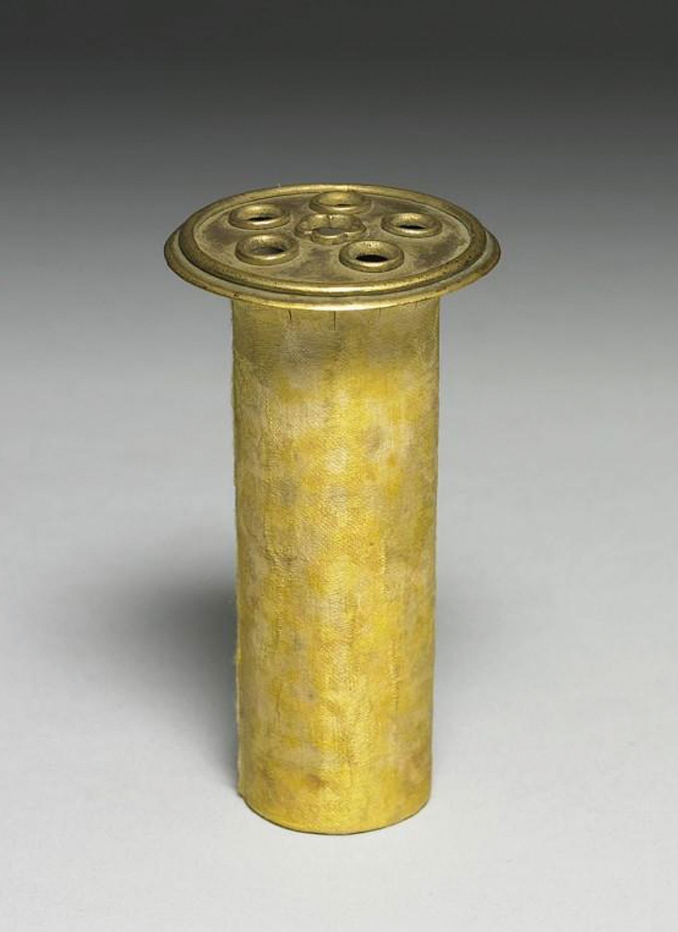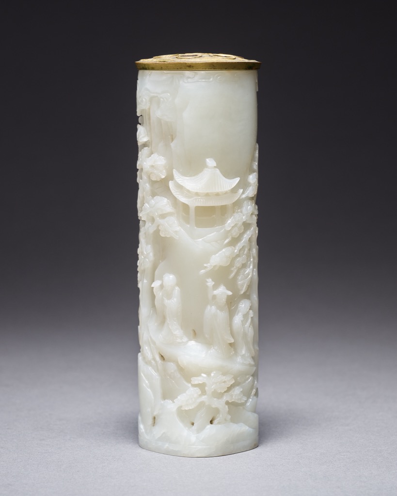 香筒本為文人書齋之供香雅器,用以貯香焚煙,清神助思,或為案頭清供,或為雅室陳設,寄託文士隱逸之志。乾隆一朝,尚文崇雅,文房器物多承明代竹雕之制,然玉代竹形,格更為崇,工更為繁。此器內設原配合金銅膽,為梅花六孔式,形式嚴謹精巧,清宮制式如出一轍,應為供插花觀賞之用,兼具雙重用途,功能與陳設並美,雅玩與實用兼容,尤為罕見,堪列清供之珍。
