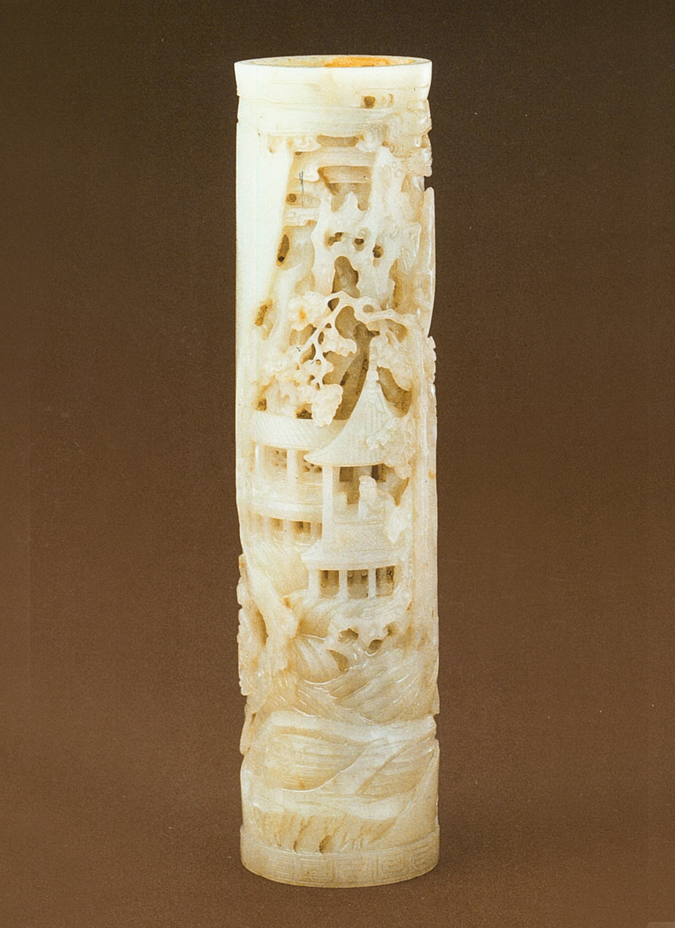 全器以高浮雕、浮雕與鏤雕技法交融運用,圍繞筒身構築出一幅通景式山水人物畫卷。所謂「通景」,乃以圓筒為卷軸,景象連綿展開,自起筆至收勢一氣呵成,畫面如流水行雲,層巒疊嶂、松石古木、亭台人物無不呼應連貫,構圖精密而過渡自然。觀者隨器旋轉,畫面流轉如夢,猶入幽谷仙境,步移景遷之間,充滿山林清遊之詩意與空靈之感。