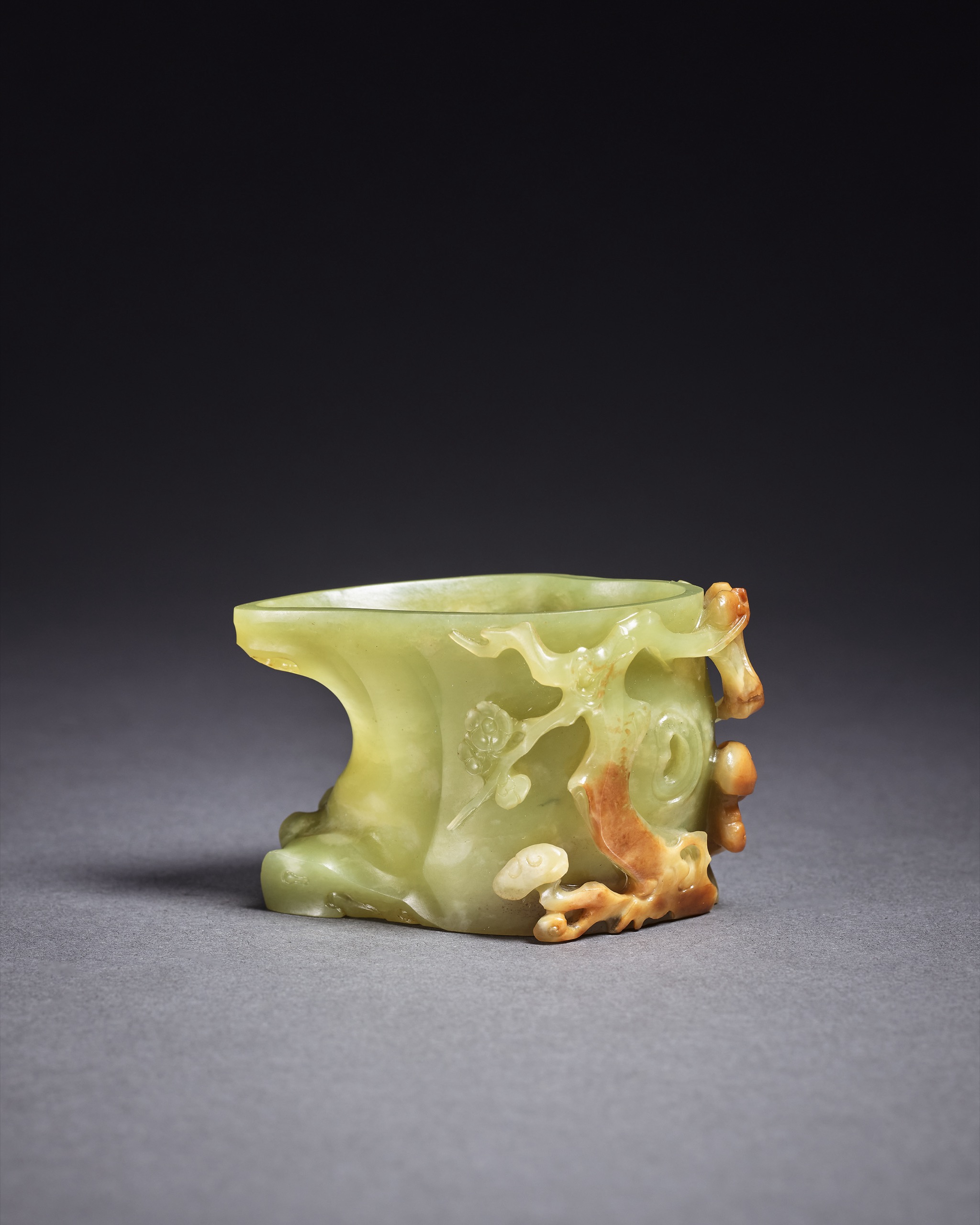 此件清乾隆黃玉梅花樹幹形盃,通體以黃玉精雕細琢而成,玉質溫潤細膩,光澤瑩潔如脂,色澤澄黃柔雅,含蓄中蘊藏貴氣。尤為難得者,盃體一側玉璞處浮現赭紅暈斑,玉工因材施藝,巧借天然色澤之變,俏色琢成梅枝虯曲、花朵綻放之象,渾然天成,妙趣橫生。黃玉為玉中珍稀,歷代少見,色純質潤者更屬鳳毛麟角,是以本器用材之珍貴,實屬難能可貴。