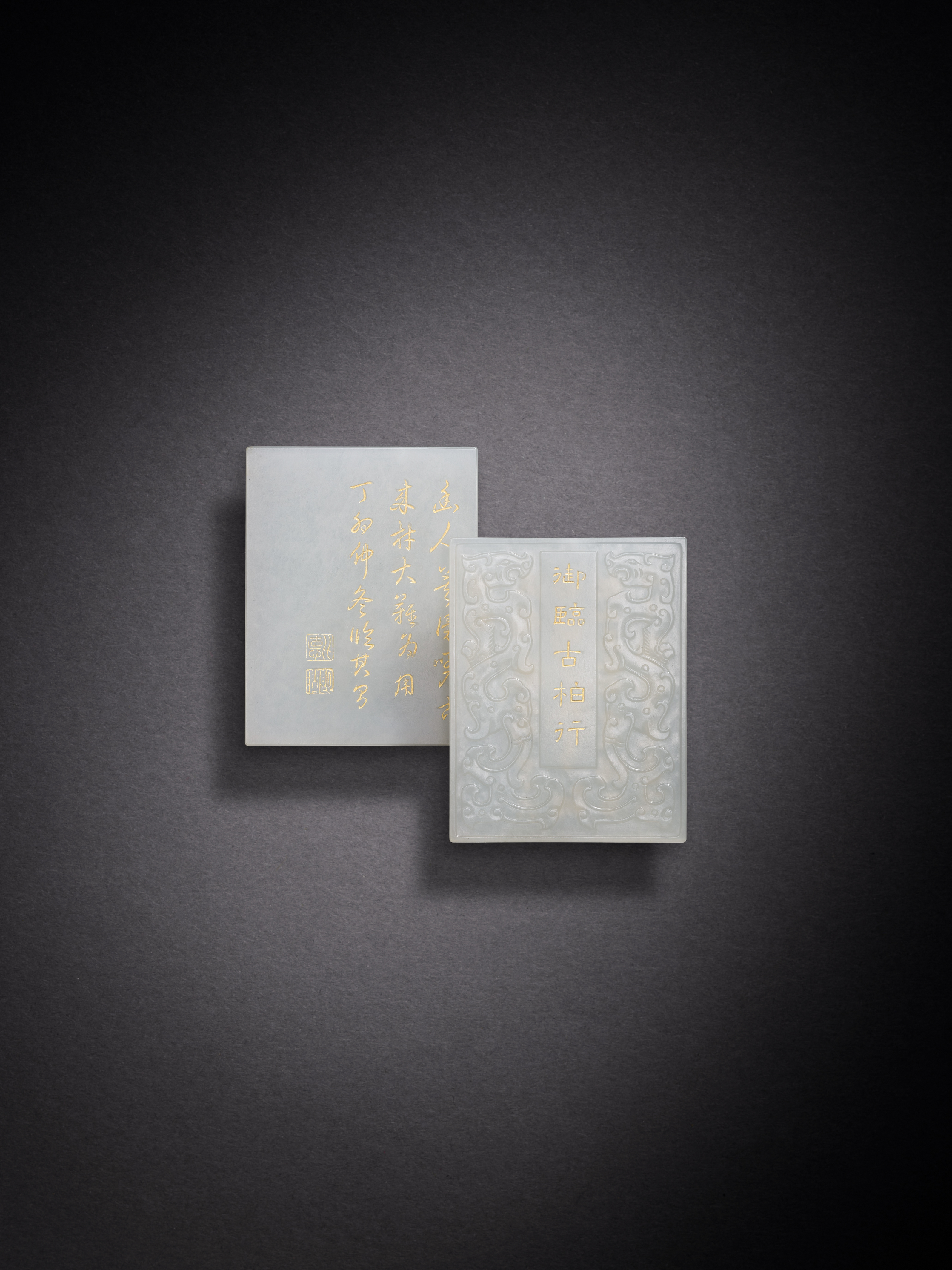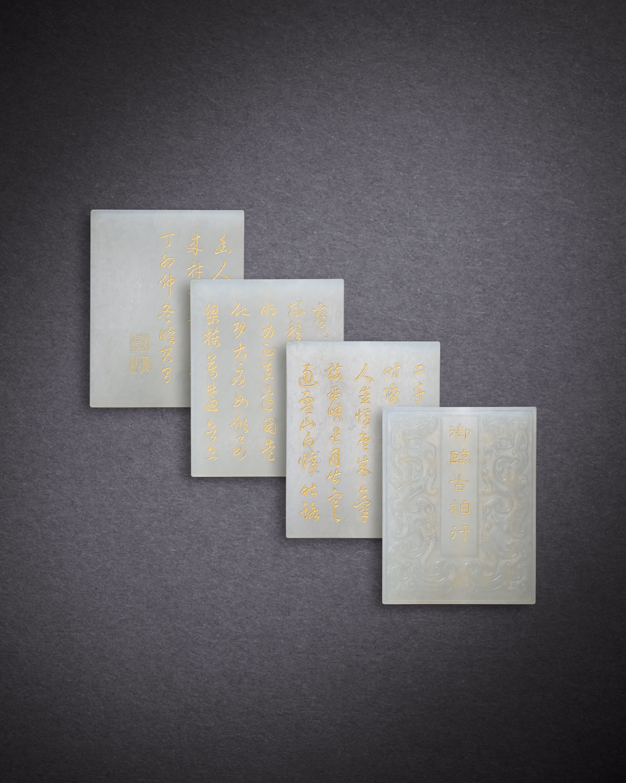 本件清乾隆御製白玉陰刻填金「御臨古柏行」詩冊,通體由四頁八面玉牒組成,冊頁皆選用上乘和闐白玉琢製而成,玉質潔白細膩,溫潤凝潔,晶瑩通透。全冊形制方整勻稱,邊角修飾圓潤,拋磨光潔,刀法挺拔細緻,展現宮廷玉器工藝之規制嚴整與精巧造詣。