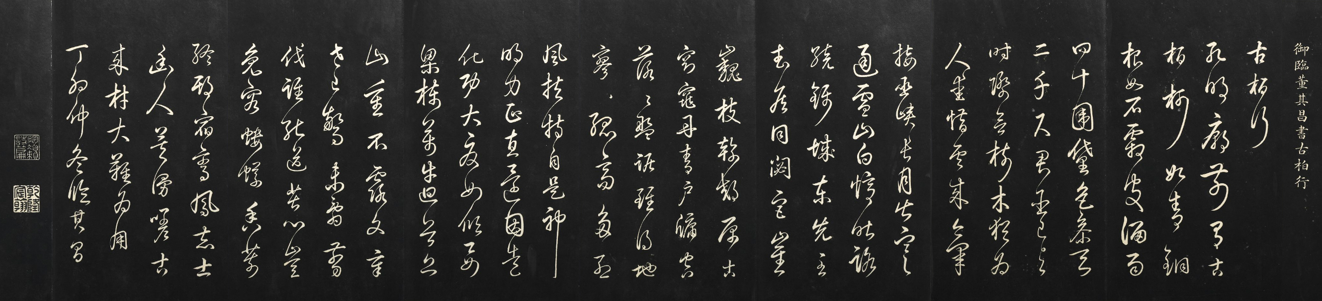 封面與封底兩面雕飾對稱夔龍紋,古樸瑰麗,氣韻莊嚴。首頁中央「御臨古柏行」五字,筆意清麗遒勁。其餘六面為乾隆皇帝御臨董其昌所書〈古柏行〉全詩,採「陰刻填金」技法:先以細具依書法筆意鐫刻筆劃,再以金泥嵌填字槽,使筆畫結構穩實,金彩明潤,筆跡與字意交相輝映。此工藝對雕刻精度、轉折圓熟與書法還原度皆有極高要求,所成裝飾典雅瑰麗。末頁鈐「比德」、「朗潤」二璽,印文端整,與整器氣韻渾然一體。