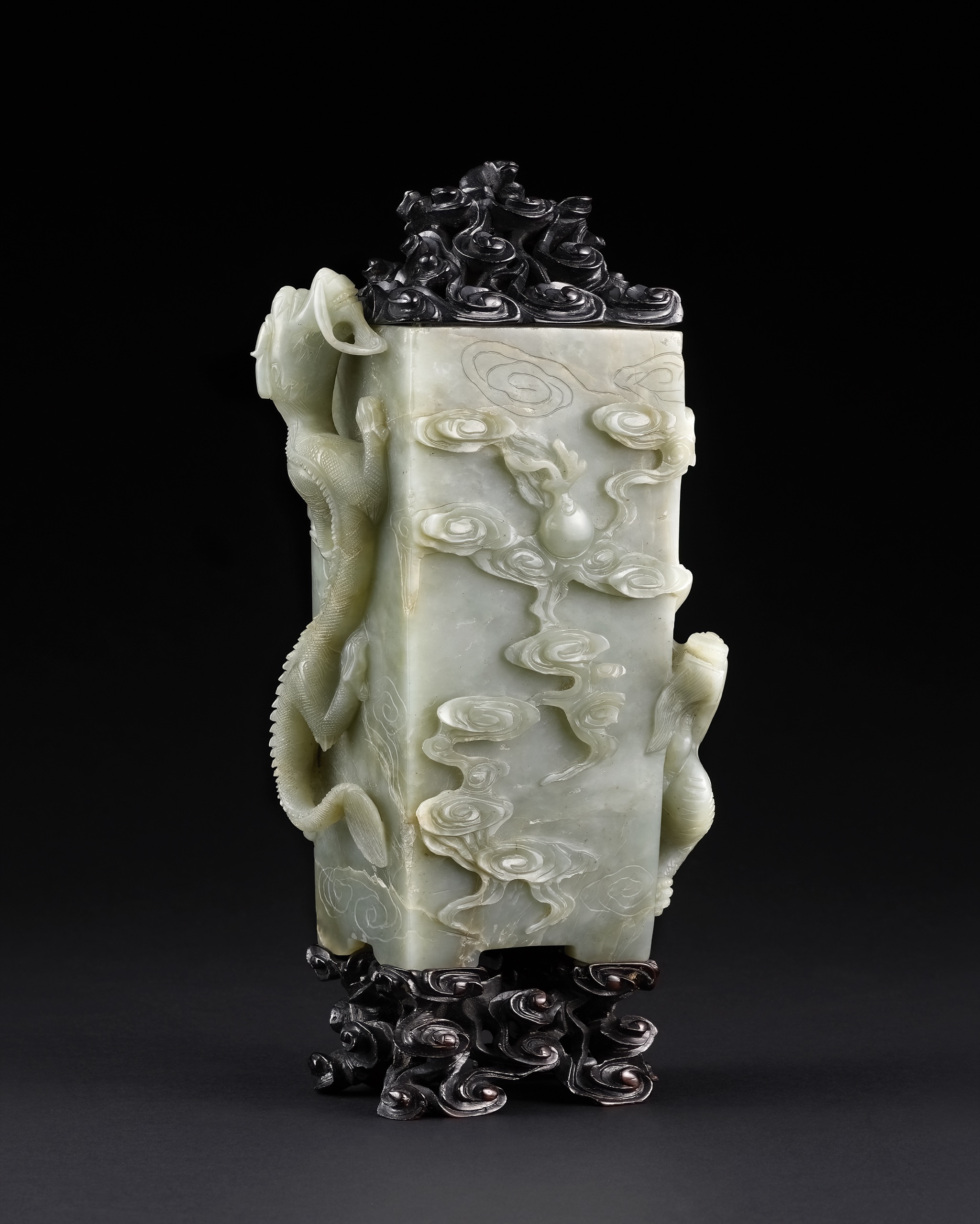 此件玉雕龍紋花插,通體作長方柱形,中空直腹,束口方整,底承四角方足,形制方正嚴整,氣度古雅莊重。器身四面滿飾紋飾,主面以高浮雕技法雕一蟠龍,自器底盤旋而上,龍首昂然挺出器口之外,雙目圓睜,口張作嘯,齒舌畢現,龍角上翹,神態威猛,氣勢迫人。頸部鱗片以細密刻線細致描繪,龍軀蜿蜒翻騰,四肢勁健有力,分踏於器側,尾部自底部盤捲而起,動態流轉,躍然器上。