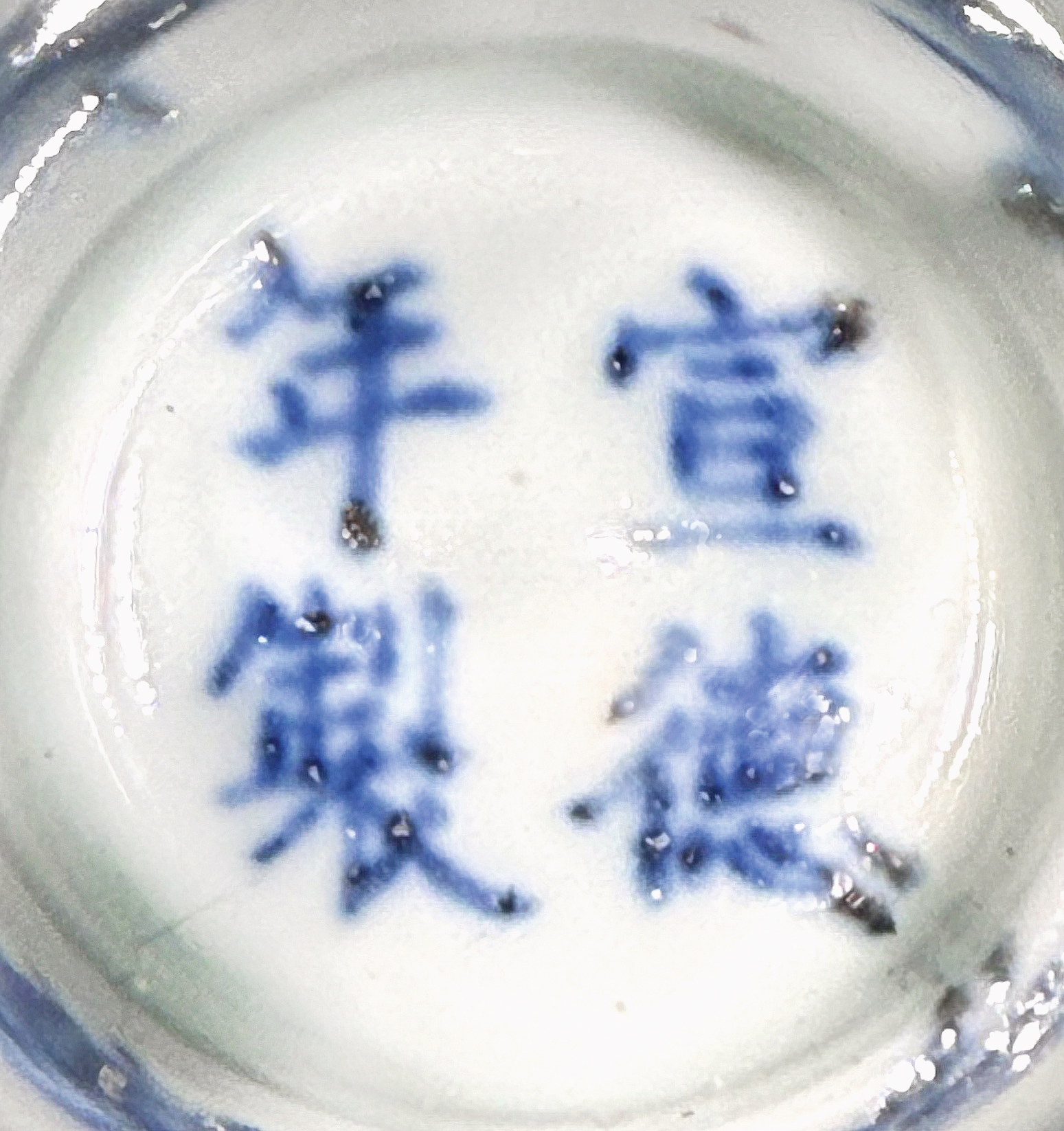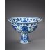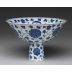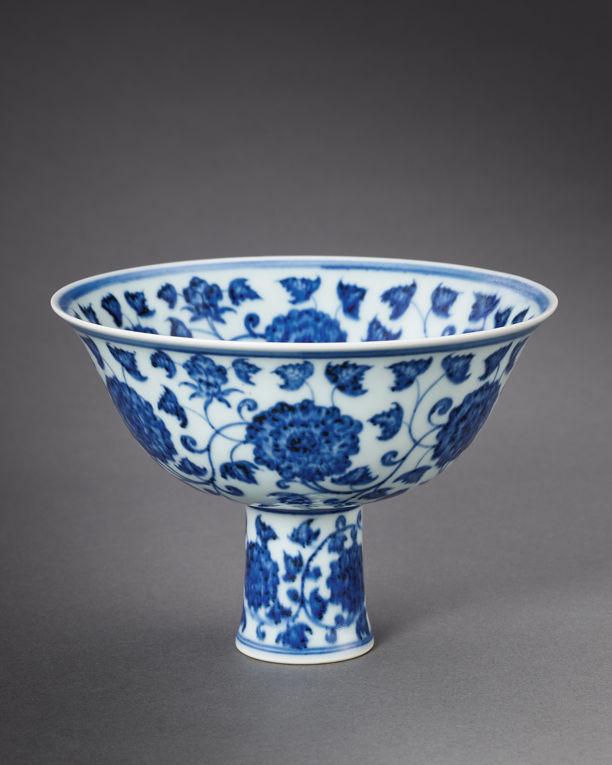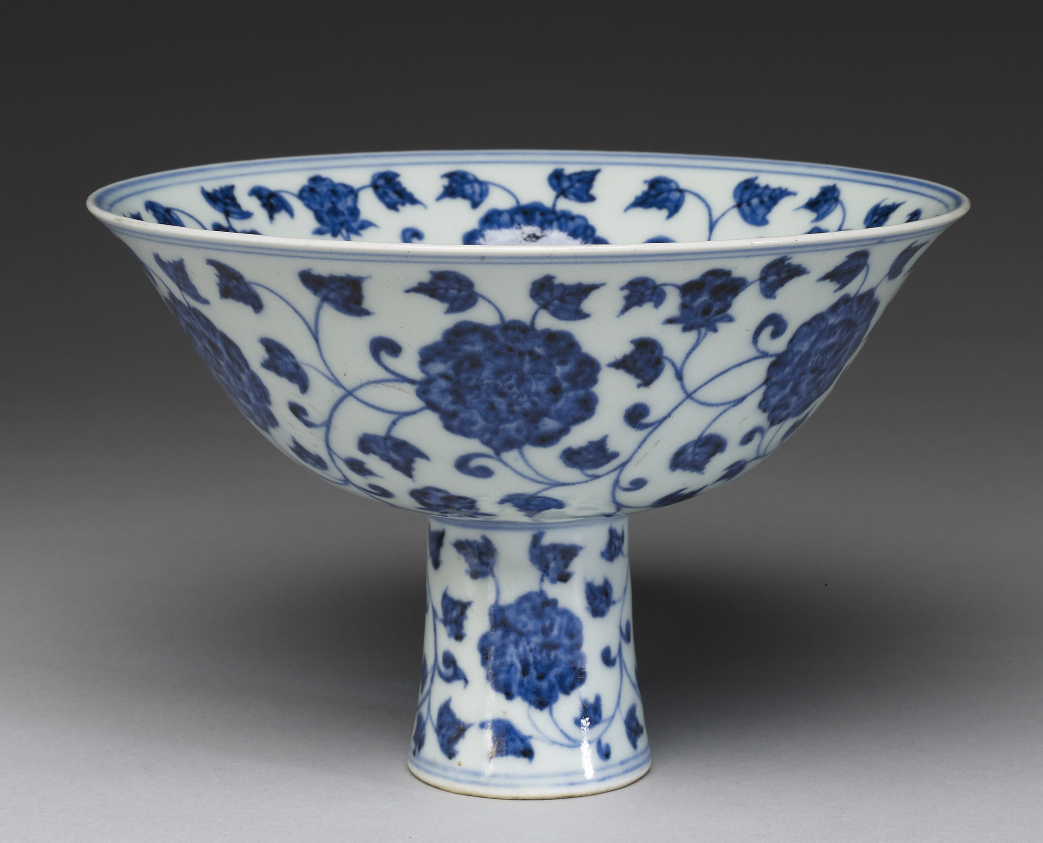 本明宣德青花纏枝芙蓉紋高足碗,形制高雅脫俗,撇口斂腹,下承高足,挺秀中見穩重。瓷胎緻密潔淨,覆釉凝潤細滑,光色溫婉。通體以青花繪纏枝芙蓉,花葉開合有致,線條轉折間呈現靜動交融之趣。圖案分佈疏密得宜,外壁主紋、高足團花與內壁開光構圖對應呼應,層次分明,氣息儒雅。繪工採雙鉤法描繪,枝蔓勁挺,花心細筆點綴,層疊渲染,層次鮮明,富於節奏。所用鈷料經高溫燒成,發色沉靜明澈,濃淡暈染如雲煙浮動。足底青花楷款「宣德年製」,筆意含蓄穩健。此器不僅展現瓷藝之精,亦體現宮廷審美之尚,典雅與端凝並蓄,觀之如覽卷舒自若的文人畫境。