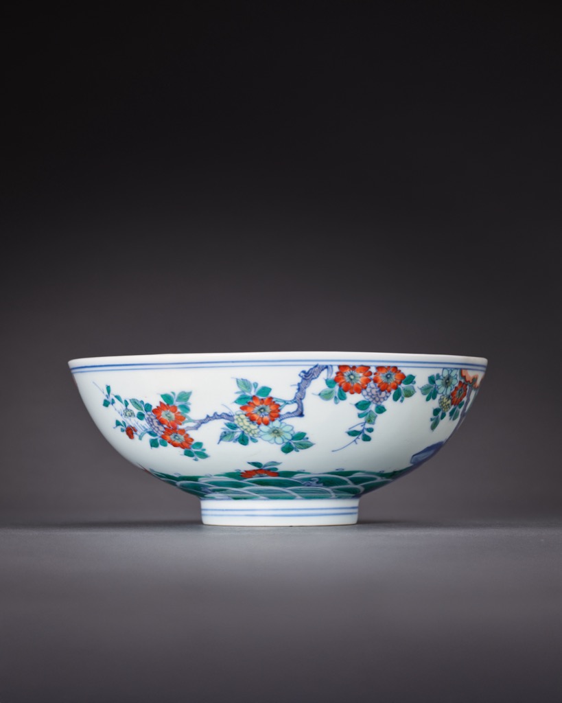 圈足內青花書「大明成化年製」雙圈六字楷書款,為康熙窯仿古寄意之作,延續成化鬥彩之文雅格調,亦見清代製瓷美學之再造昇華。此碗詩畫合一,筆墨含蓄深遠,為鬥彩瓷器中別具意趣之佳例。