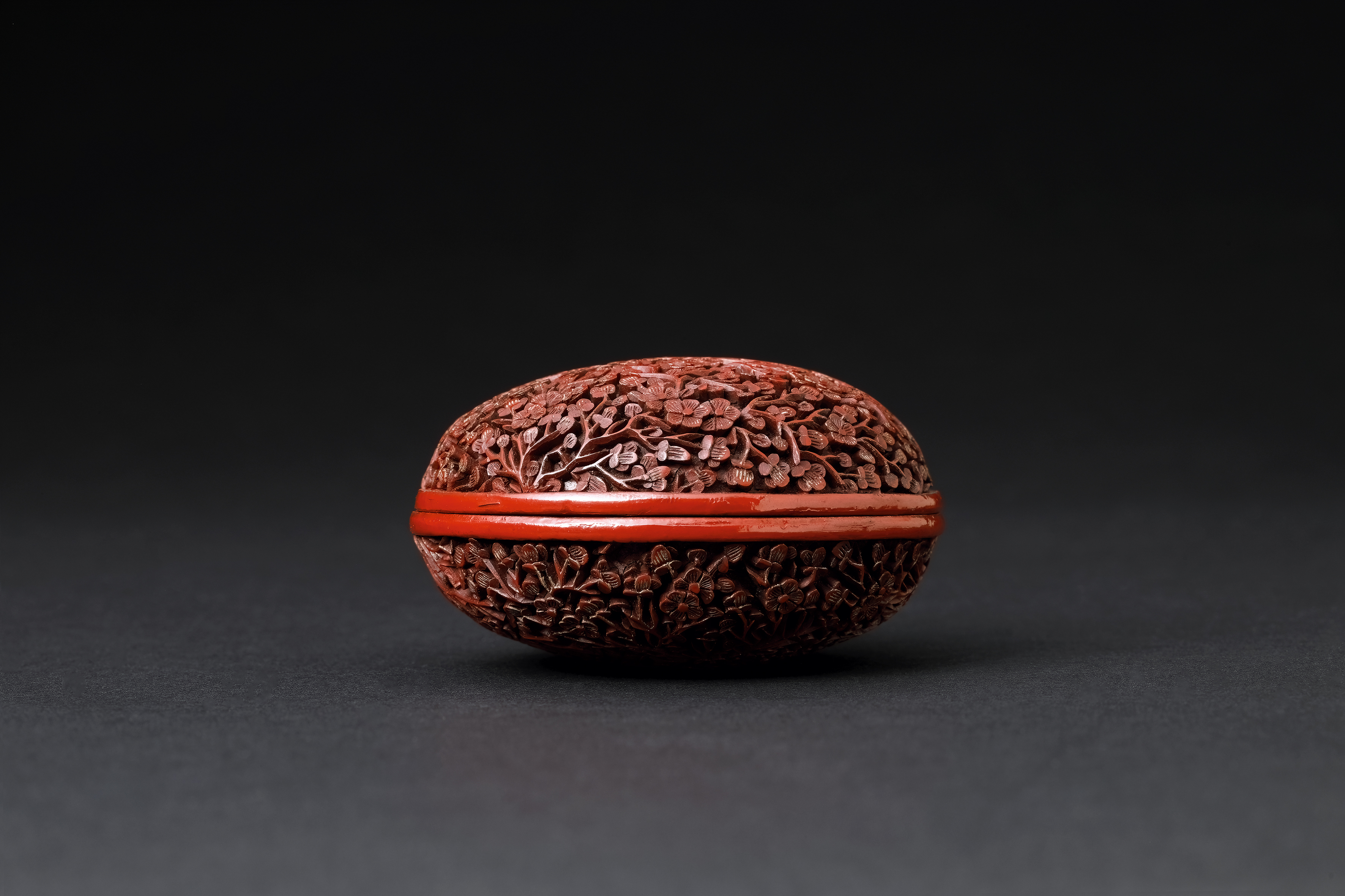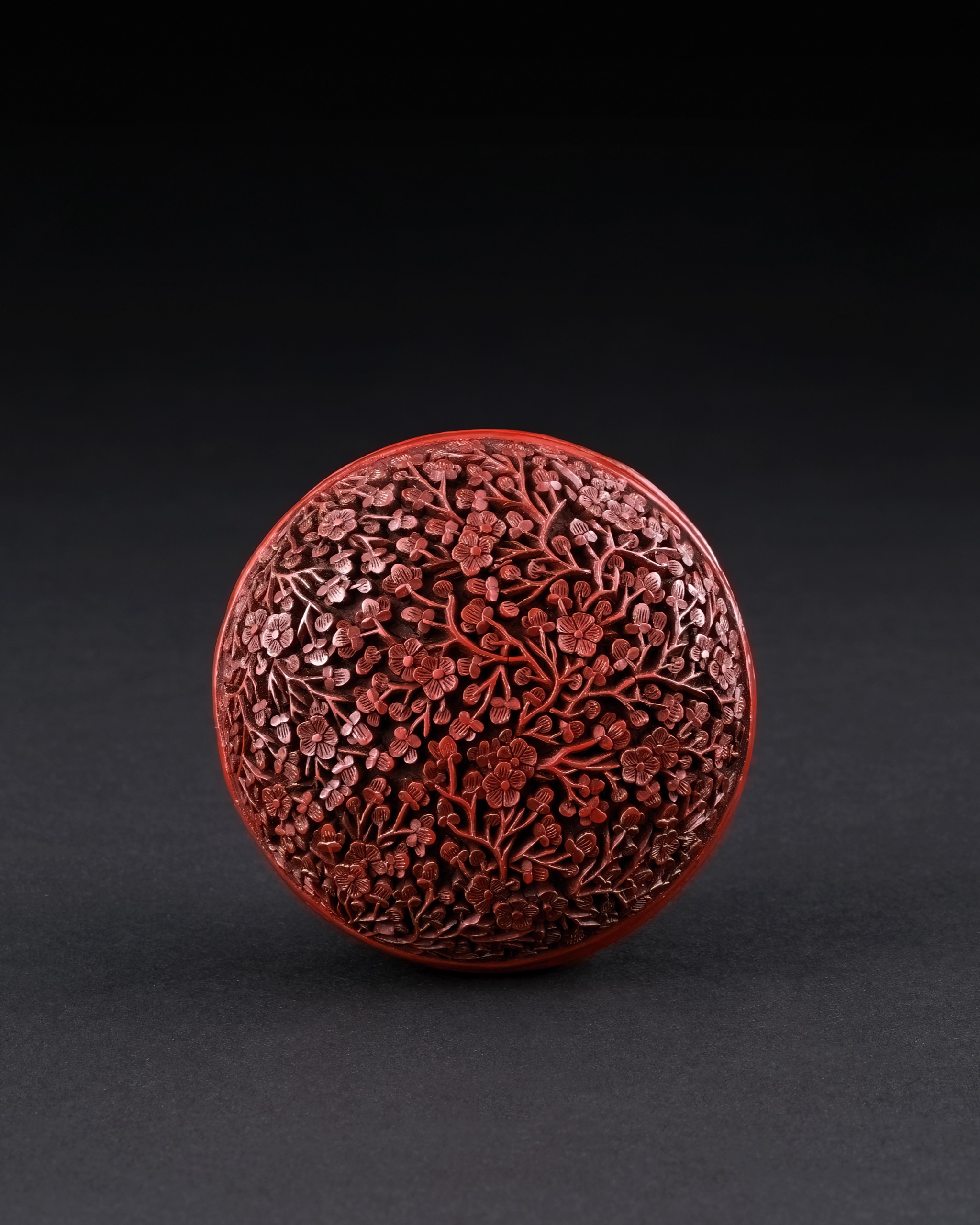 此件清代剔紅印盒,呈扁圓形制,整體造型小巧端莊,比例均衡。盒蓋與盒身雙面雕飾,技藝精謹,通體髹以朱漆,朱漆色澤沉穩,層層漆胎厚積,剔刻深峻,展現出優異的漆工工藝。