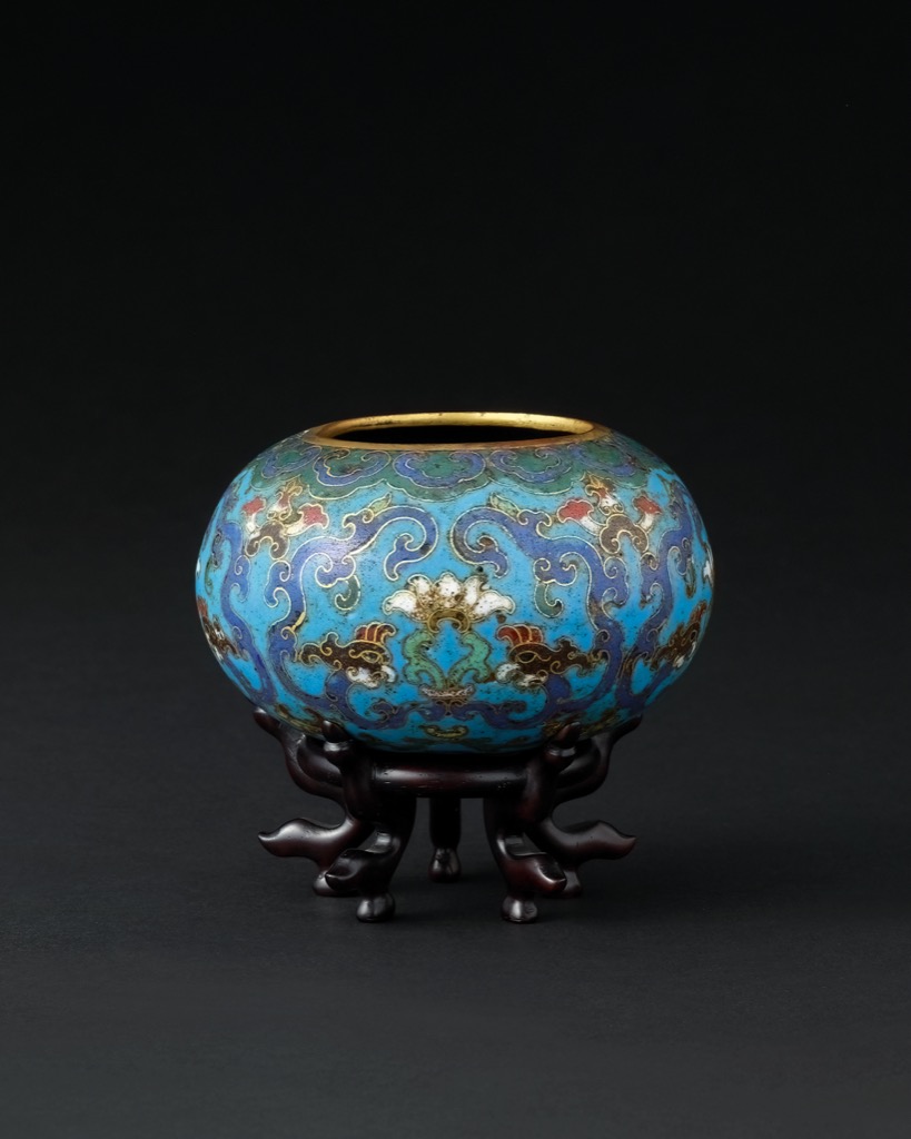 此件掐絲琺瑯鉢式爐,形制渾圓穩健,線條婉轉含蓄,器身簡潔而飽滿,自顯端凝氣度。通體以銅為胎,壁厚堅實,重心沉穩,比例勻稱得宜。外壁通施掐絲琺瑯,以天藍為地,釉色澄澈而沉靜,表面細膩溫潤,光澤內斂隱映,映現宮廷器物所特有之端雅格韻。