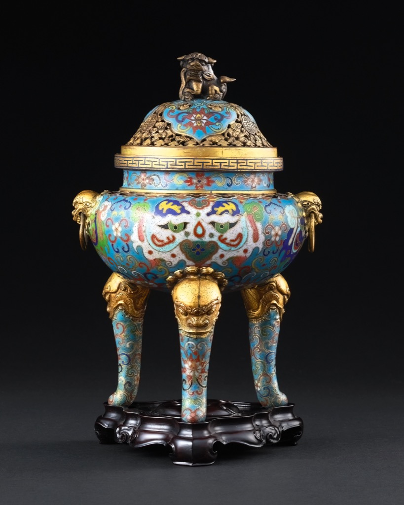 本件掐絲琺瑯蓋爐,構造嚴整,氣度恢宏,通體以銅為胎,分為蓋、爐、耳、足四部分,形制渾然天成。爐蓋高隆,上置鎏金獅鈕,獅首昂揚,鬃髮飛揚,神態威嚴生動。蓋面滿飾雲紋,間以鏤雕蝙蝠捧壽圖案,象徵福壽雙全。鏤雕線條繁縟有致,細節精緻,氣息華麗,盡顯匠人技藝之精妙。