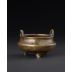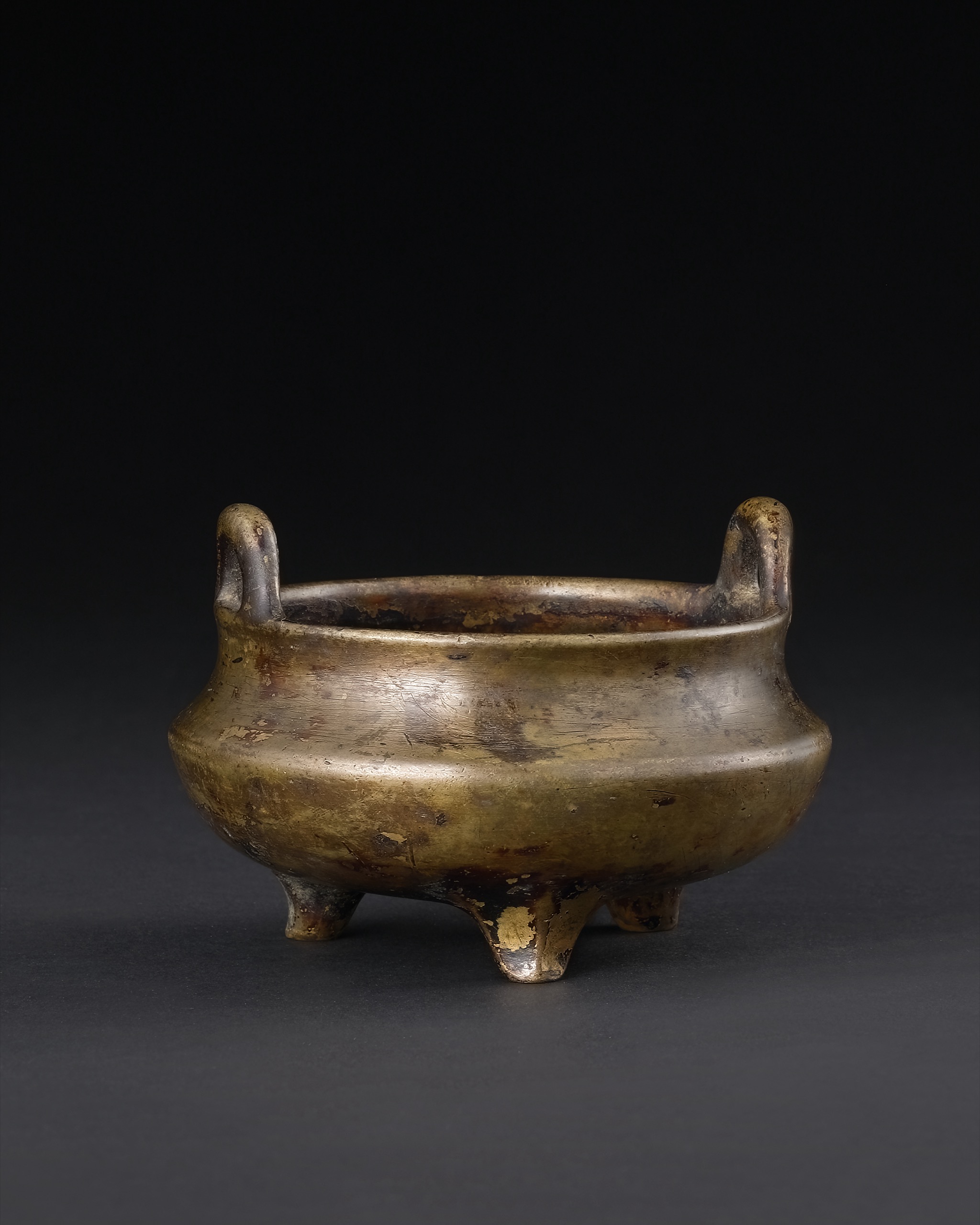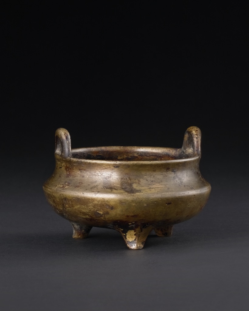 此件沖耳三足爐,銅質精良,色澤金褐潤澤,間見自然氧化斑駁,古韻盎然。器形渾圓飽滿,侈口厚唇,轉折內收,下腹漸斂而承三足,比例勻稱,線條勻整而富張力。肩部特作內凹,起伏自然,造型古雅別致,自具一格。