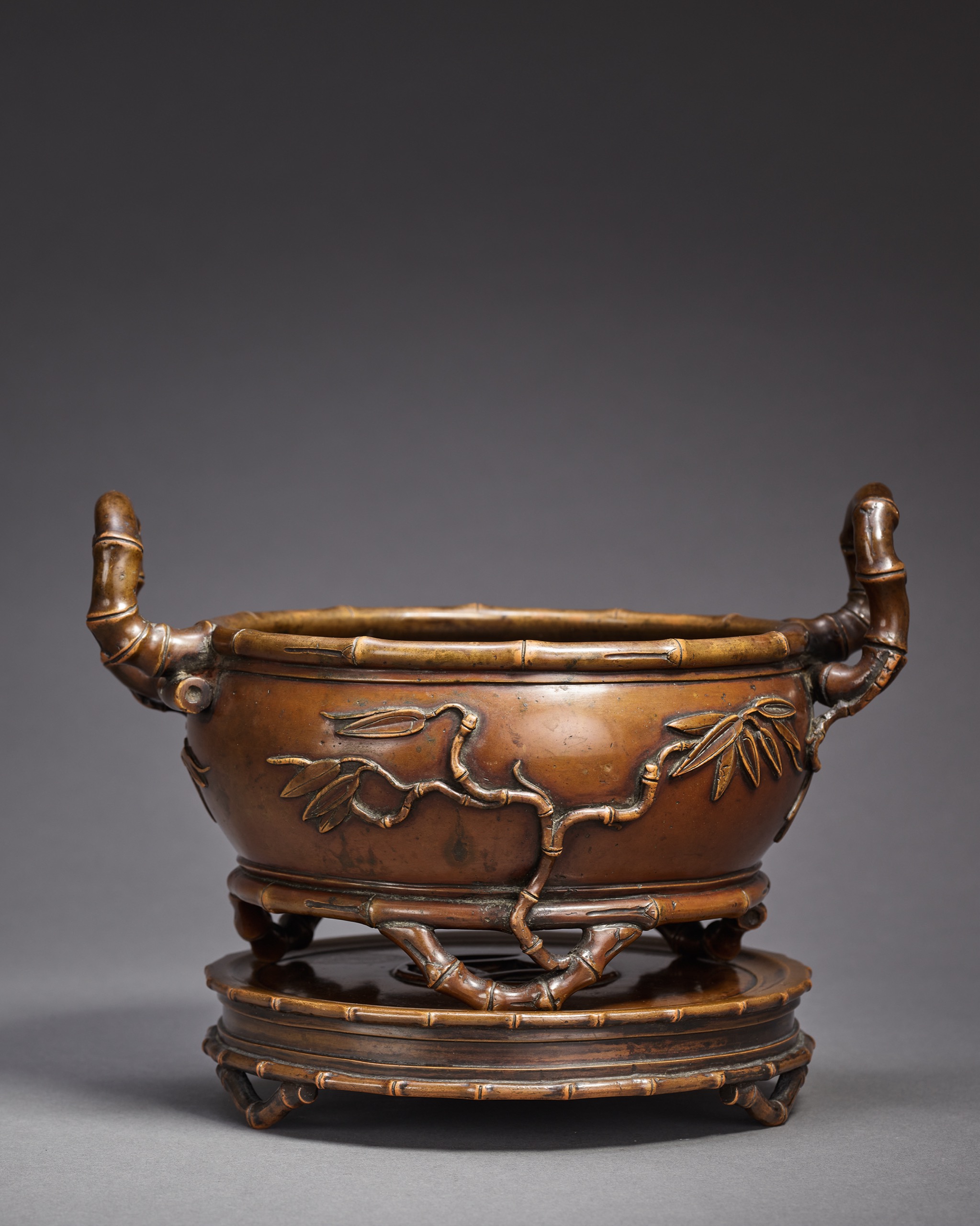 此件三足銅爐連座,形制穩重雍容,通體依竹節為意,鋳造成形,爐身外壁淺浮雕高竹枝葉,線條婉轉舒展,器表光澤沉靜柔潤,蘊含自然野趣與文人氣息。爐口及耳皆作竹節樣,二耳高聳上舉,作「朝天耳」式,弧轉勻稱,姿態挺拔;三足亦模擬竹枝分杈狀,與底座相銜自然,展現匠人設計巧思與對自然形態之敏銳觀察。所附底座亦仿竹節製成,層次疊合,氣韻一致,與主體相得益彰,完整保留原配陳設狀態,尤為難得。