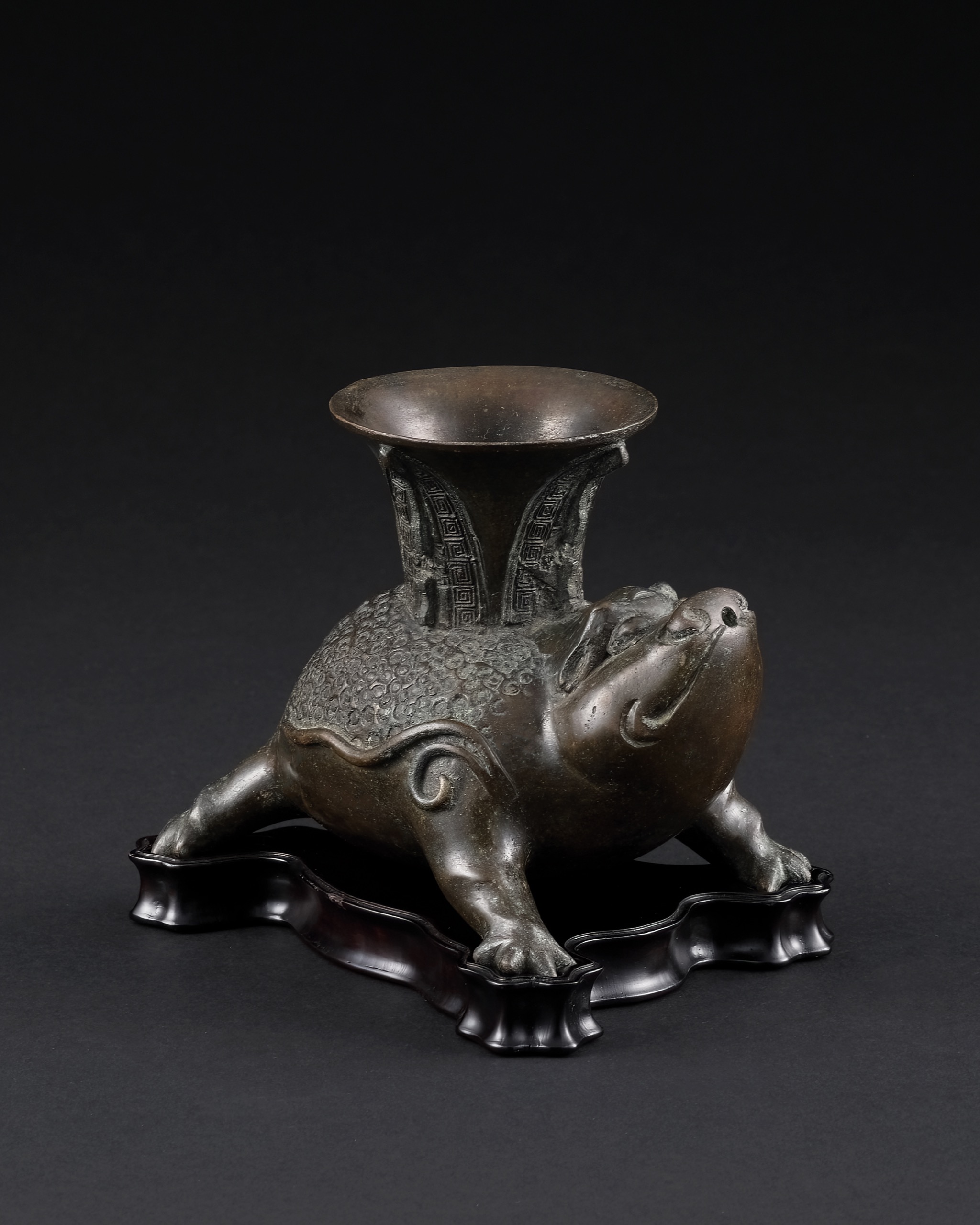 其背部鑄一觚形水柱,飾以蕉葉紋圖案,繁密而對稱,紋飾細膩精緻。背面表面以連珠圓點鋪排,模仿金蟾皮膚質感,造工極具巧思,層次分明,兼具裝飾效果與寫實神韻。整器既為實用水滴,亦富象徵意涵,民間傳說金蟾能吐錢,為招財納福之瑞獸,與「泉水」諧音「錢水」,具「一滴吐錢」之吉意,設計巧妙,匠心獨運。