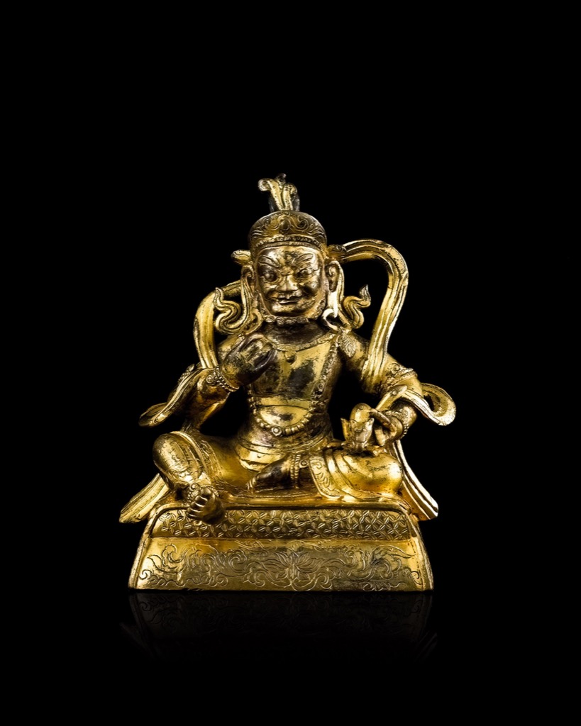 此尊財神像以銅鑄鎏金,形象莊嚴勇猛,寶冠高聳,雙目圓睜,眉梢上揚,面容剛毅威嚴,顯示忿怒相之守護神威。右手當胸結期克印,左手握持吐寶鼬,象徵財富源源不絕、福德無盡。