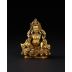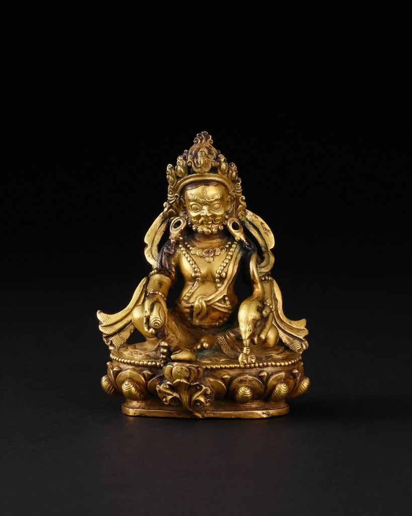 黃財神,為藏傳佛教五姓財神之一,象徵福德富饒,能導引眾生獲得世間財富與修行資糧,成就世出世間諸願。此尊通體鎏金,頭戴寶冠,面容圓滿,雙目圓睜,張口露齒,具忿怒相。胸佩瓔珞,帛帶繞身。右手施財印,左手持吐寶鼠,象徵賜財之義。蓮座仰覆相接,蓮瓣挺秀,座緣飾紋整齊,構造嚴整。