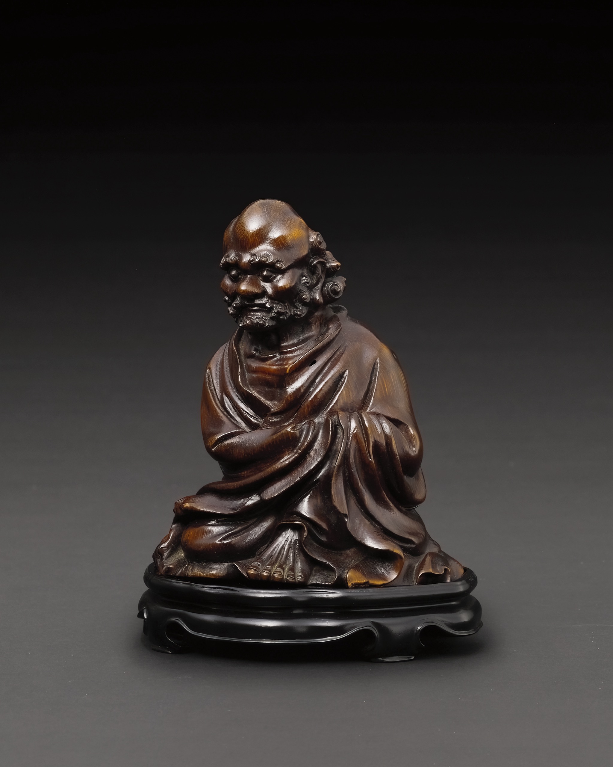 此件羅漢坐像以質地堅韌之竹根雕製而成,形貌古穆沉靜,體態穩健端凝。雕刻者運刀嫻熟,線條流轉自然,袈裟衣紋層層疊疊,褶皺起伏有致,衣角翻卷處富於動感,與靜定坐姿相映成趣,形神兼備。