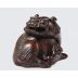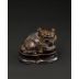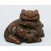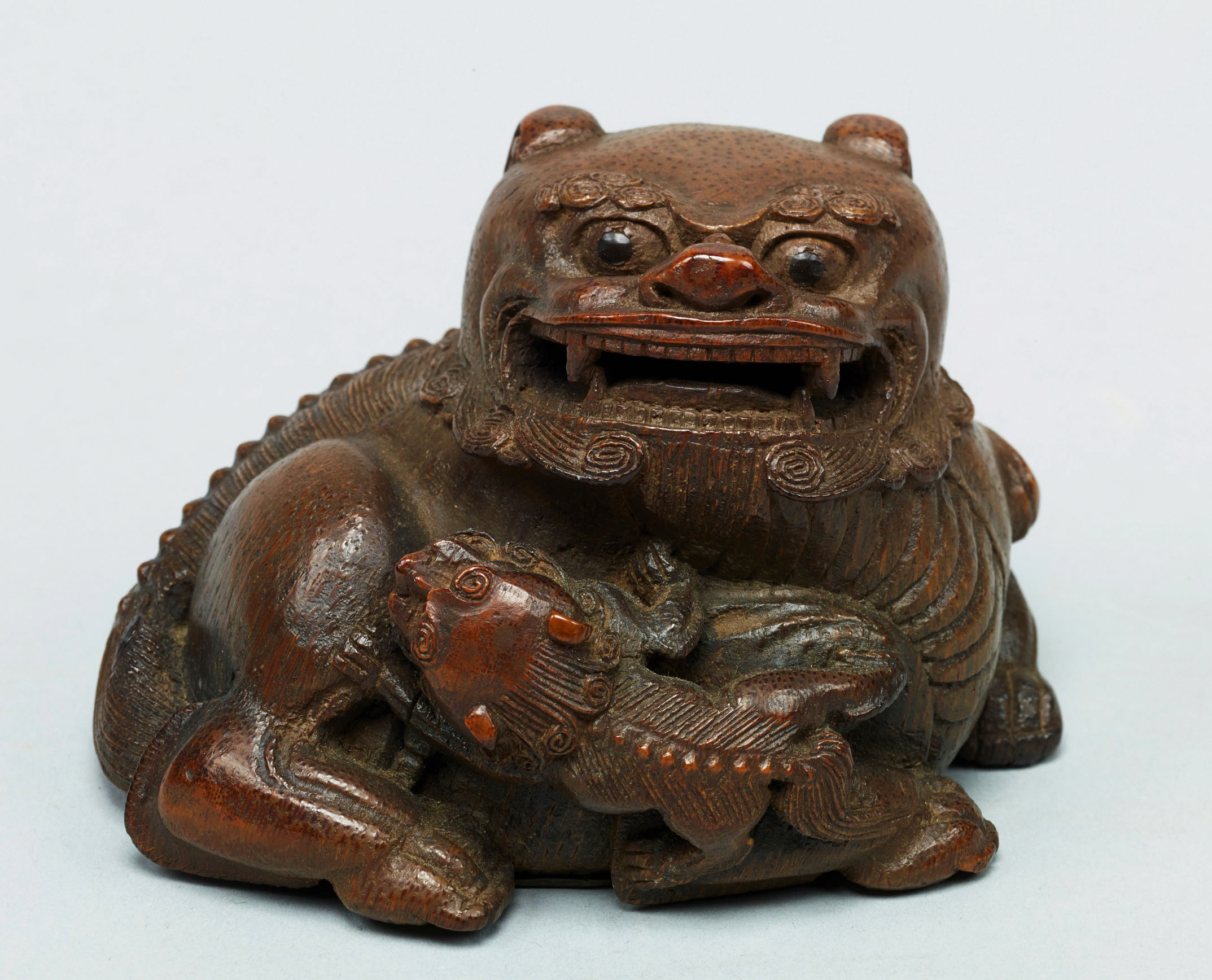 作品以竹根雕製,形作太獅抱仔之態,構思巧妙,形神兼備。太獅匍匐回首,雙目圓睜,獠牙微露,神態威猛之中不失慈祥;懷中少獅依偎戲耍,神情稚拙可愛,倍添天真童趣。二獅一動一靜,動勢凝煉,情態呼應,富於表情與情境張力,展現藝匠高超之藝術掌握與造境之能。