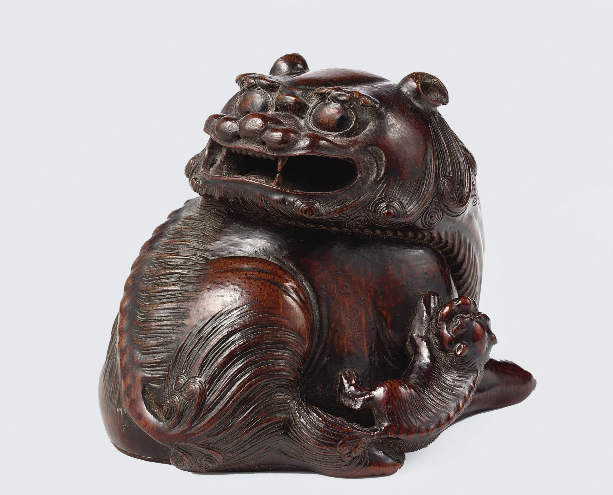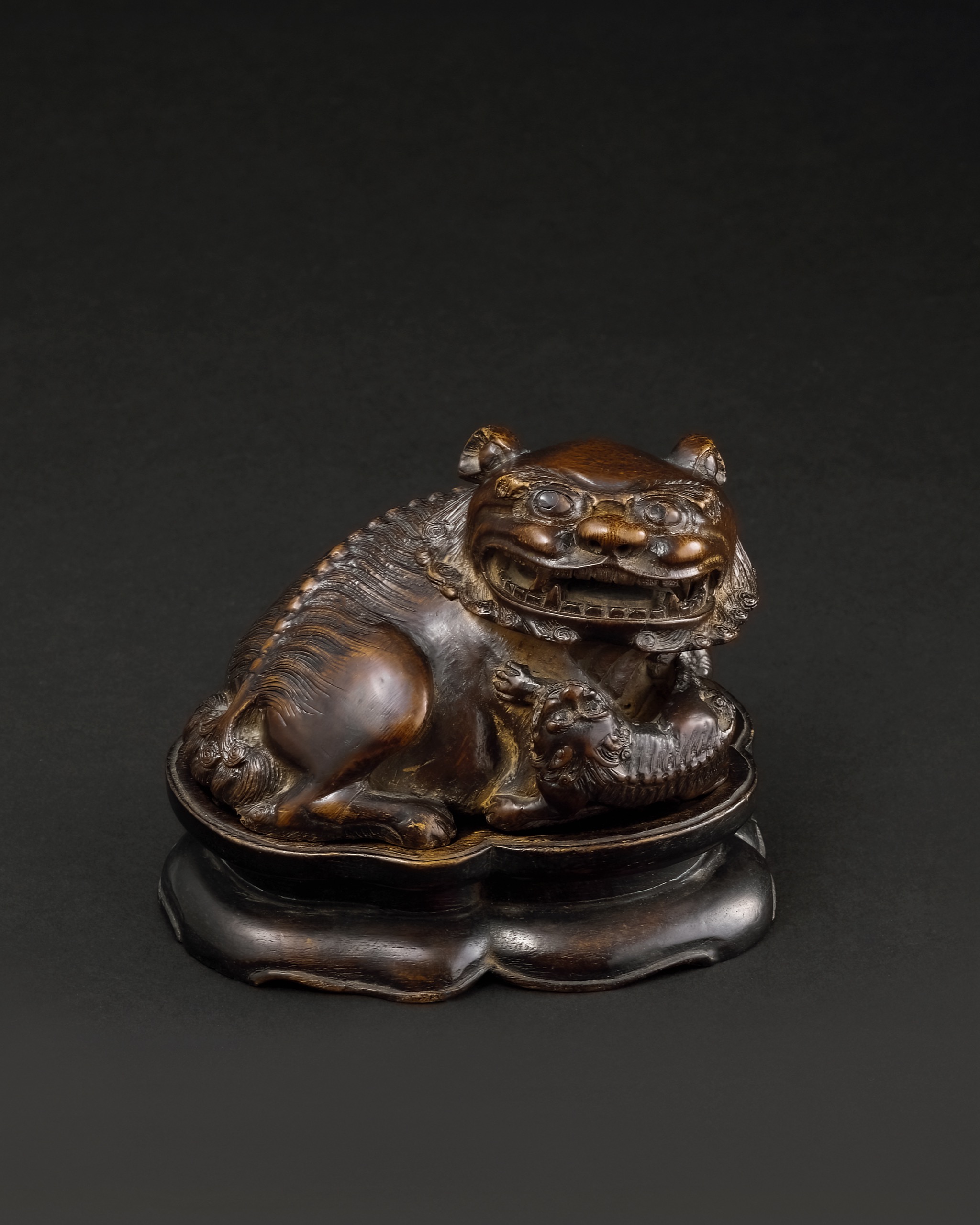 「太獅少獅」為明清以來竹雕常見之瑞獸主題,寓意多子多福、子嗣昌盛,尤為士人階層所珍賞。本件構圖飽滿,情態生動,神韻兼具,雕工嫻熟,富於意趣。原為寒舍舊藏,並配有原老木座,通體氣息沉穩雅逸,為一件集工藝之妙與寓意之美於一體之佳作,足堪案頭清賞,亦宜珍藏品鑑,傳世可期。