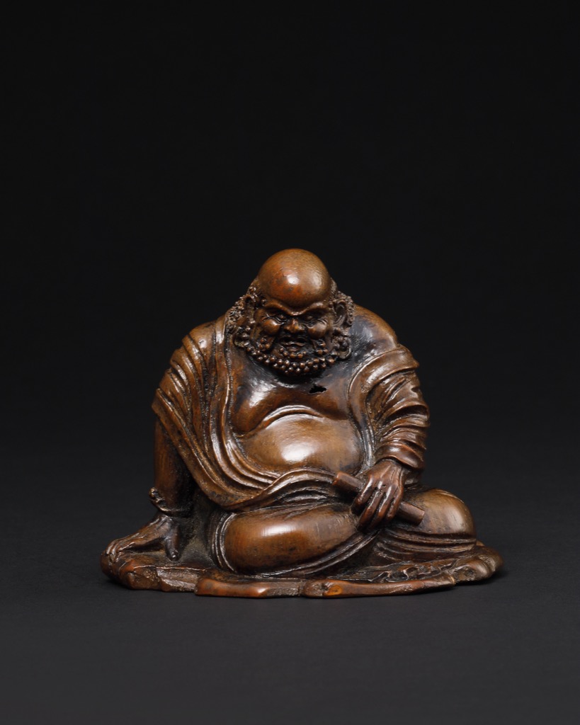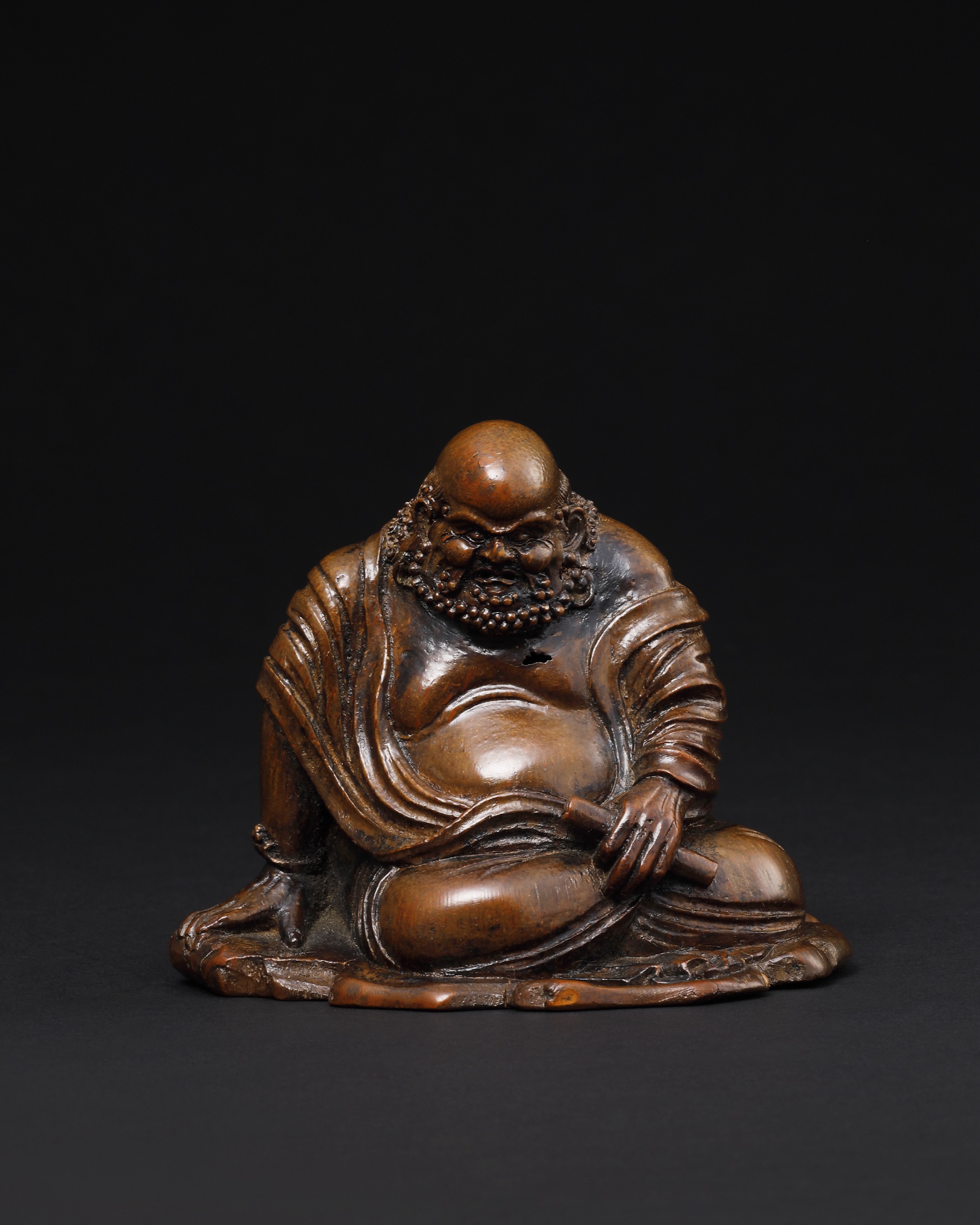 竹雕禪坐達摩像,採圓雕技法刻製而成。達摩結跏趺坐於不規則形木座之上,軀體壯碩,袒胸露腹,神情凝峻,雙眉緊蹙,目光炯炯,表現出堅定沉靜之禪定氣息。頭部禿頂,環鬢濃鬚上捲,嘴角微抿,面容具力度與張力。身披大袍,衣褶厚重,層層交疊,線條起伏轉折自然,衣紋背後亦見刀法流轉。右手持拂塵,橫置於腿前,左手自然下垂置於膝側,肢體比例得當,坐姿穩健。