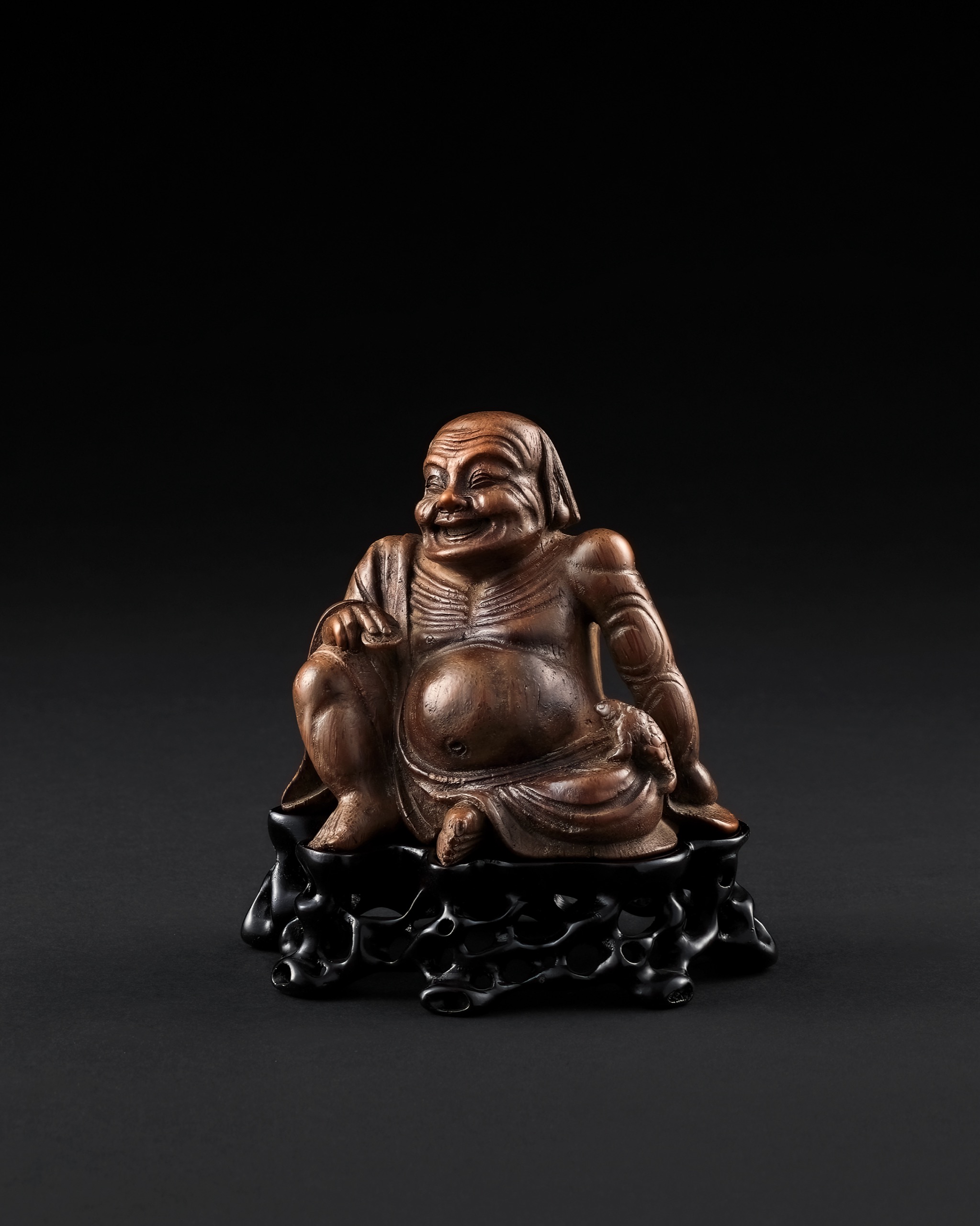 此件竹雕取材自傳統吉祥題材「劉海戲金蟾」,構圖簡練,寓意明確。劉海雕作童子形象,席地而坐,身體前傾,赤足袒胸,面帶微笑,神情喜悅中流露童趣。胸腹隆起,肢體線條誇張有力,衣褶簡潔,衣紋流暢自然,披髮束於腦後,隨形披散,展現動勢與生活氣息。