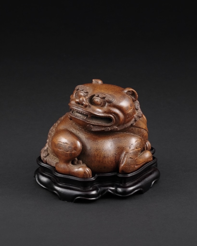 獅形盃通體以整段竹根雕製而成,保留竹質自然色澤,經細膩磨製後呈現出溫潤光澤。整體作一蹲伏獅子之姿,雙目圓睜,鼻樑高起,口微張,露出尖齒,神態警覺中帶有稚氣。獅體結實渾圓,四足曲收於身前,左前足自然隆起,似作半倚之勢,動勢靜中寓動。