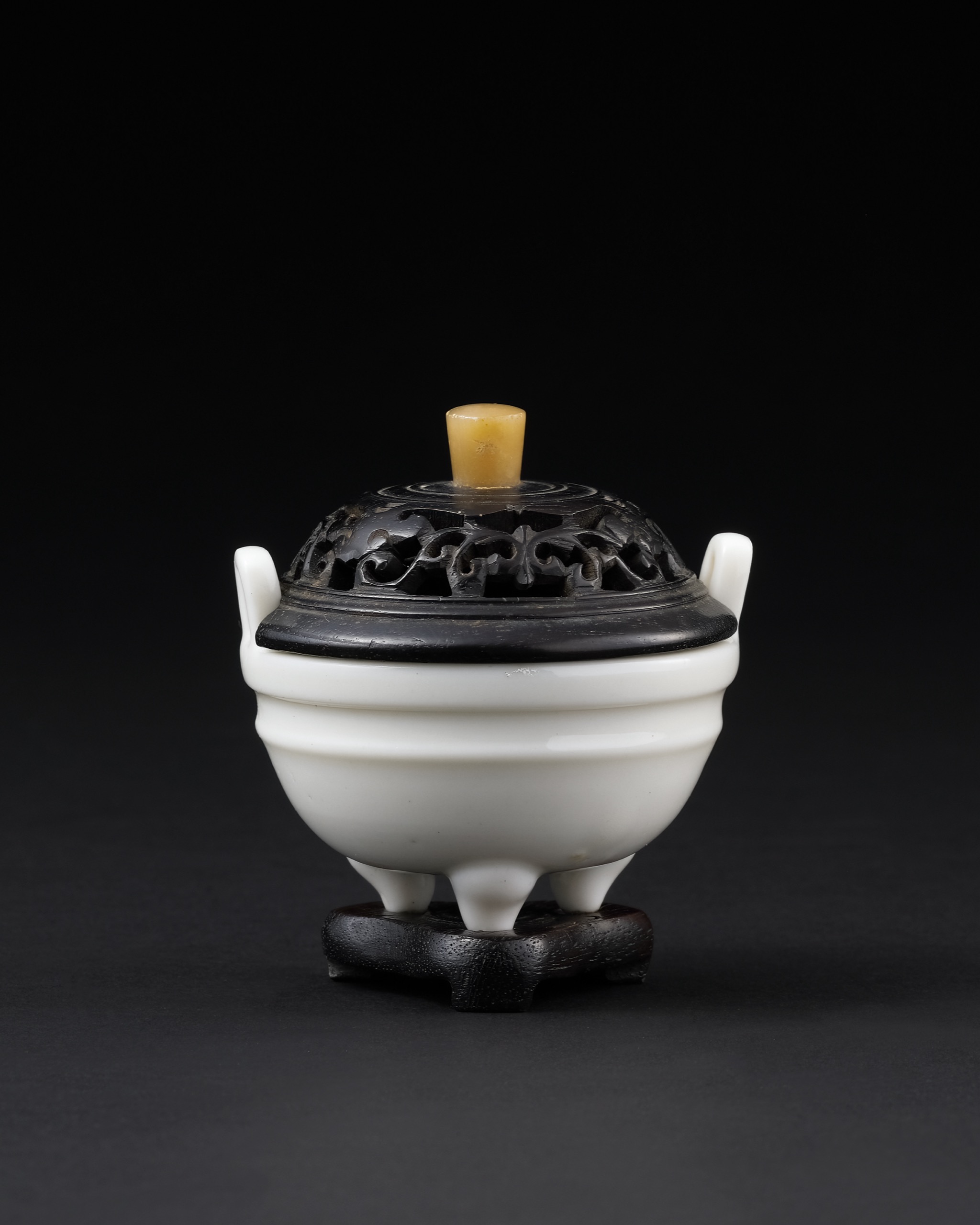 此件爐為小式琴爐形制,器形端正清朗,比例精嚴,三足微內斂,造型簡淨沉穩,蘊含文人器物之清遠風致。通體施潤白釉,色澤柔和瑩潔,釉面細膩凝潤,光素無紋,予人潔淨素雅之感。爐沿對稱沖耳高聳,耳形方中帶圓,輪廓挺拔勻稱;下承三足,實心模製,微呈圓柱,與器身過渡自然。沖耳與三足呼應環構,映襯敦實腹體,使全器於穩重中見挺拔之姿,虛實得宜,動靜相生。
