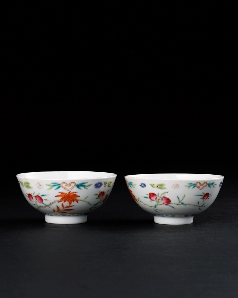 此對茶鐘器形小巧雅致,碗口微撇,弧腹內斂下收,承於圈足之上,線條圓轉流暢,形制端正而富韻致。通體以粉彩繪飾吉祥紋樣,碗腹描繪壽桃、蝙蝠與雁來紅,構圖疏朗清逸而富有層次,筆意細緻,設色明快而不失溫潤。彩釉融和於瓷面之上,色澤柔和雅緻,。所繪紋飾寓「福壽雙全」之意,象徵康寧延年,寄寓吉祥美好之願。