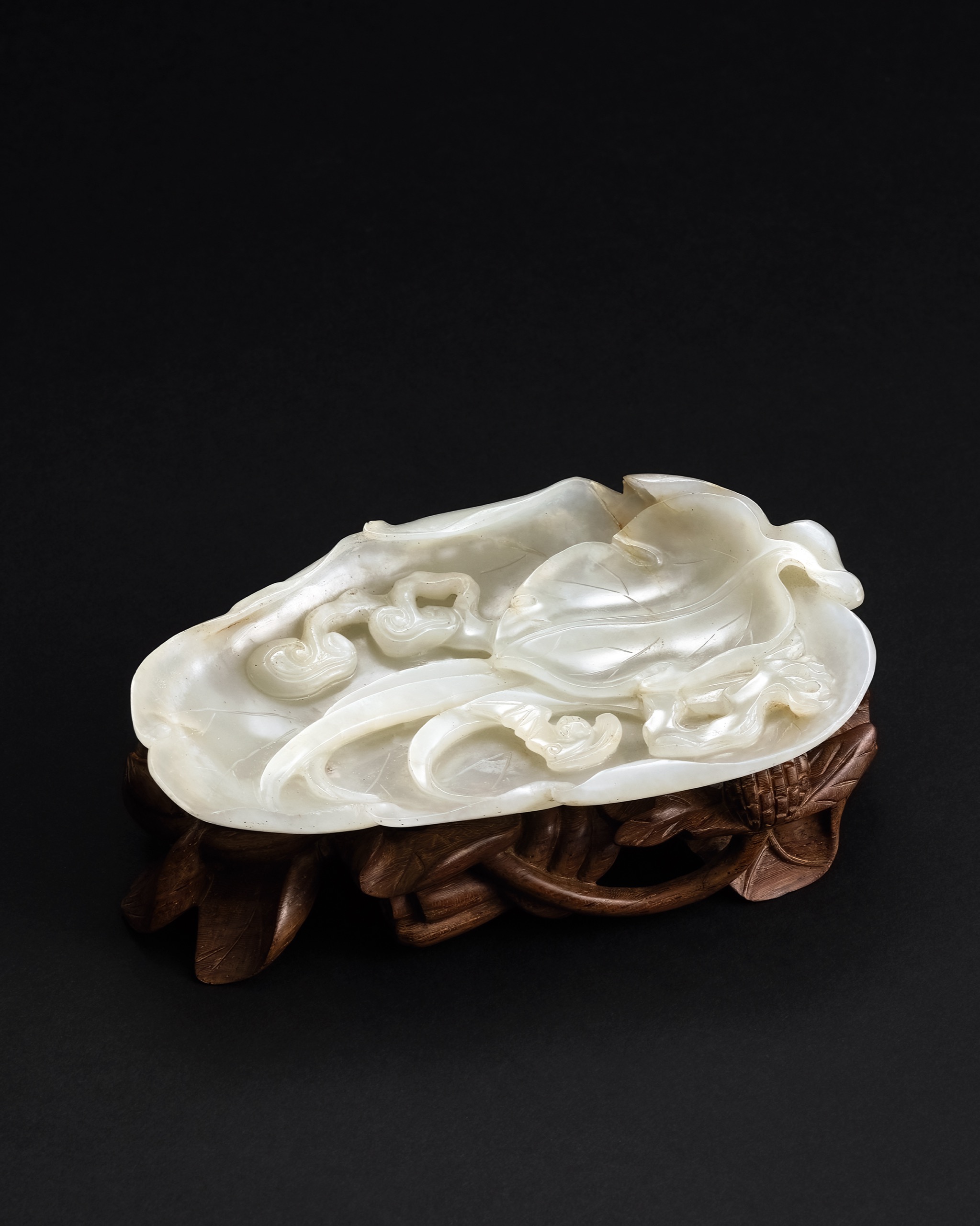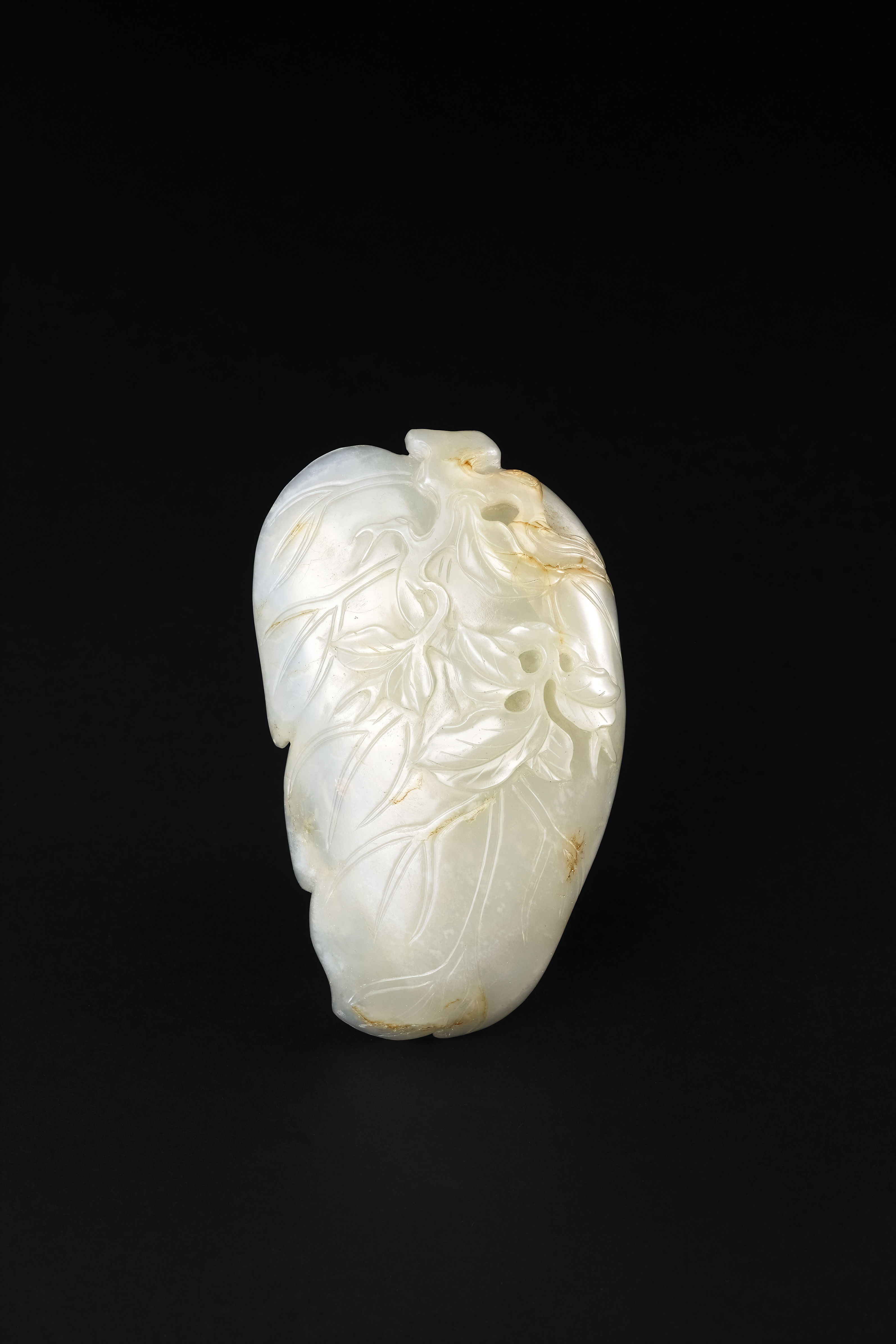 筆掭由整料白玉雕成,玉質細膩溫潤,局部見天然黃沁,古雅含蓄。器形擬展葉之態,邊緣自然起伏,葉脈隱約可辨,線條柔婉流暢。葉梗微隆,器端微翹,宛如嫩葉初舒,神態生動,自具自然之趣。