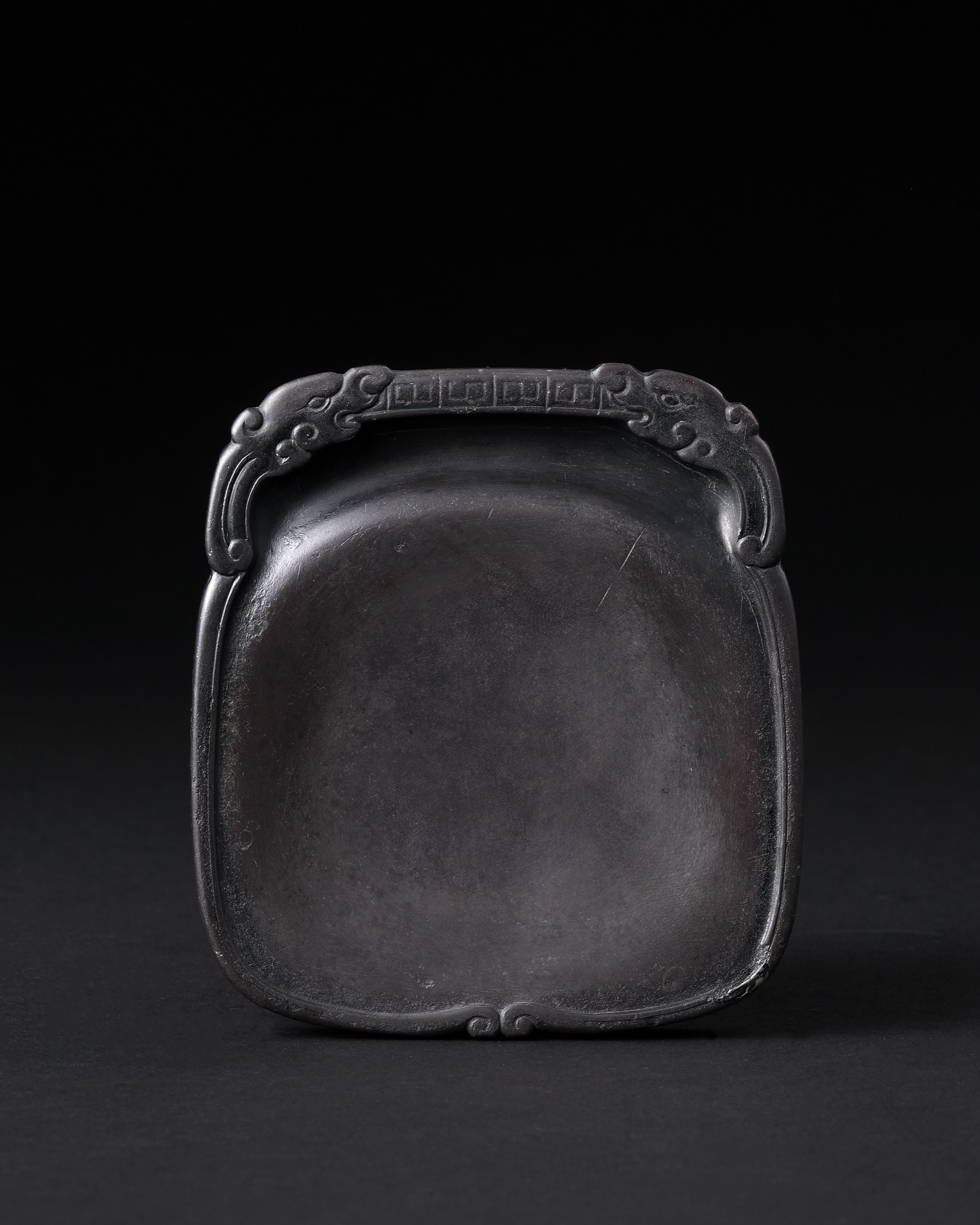 硯首雕夔龍紋,雙龍對稱攀附於硯額兩側,龍首昂揚,卷角挺立,身軀蜿蜒化為裝飾線條,與中央壓地陽文回紋橫梁相接,古意盎然而不流於繁縟。硯堂平廣,墨池弧面自然起伏,拋磨細緻,宜於發墨;硯底亦經打磨修整,平實穩重,背面素淨無紋,突顯書齋器物之本色。