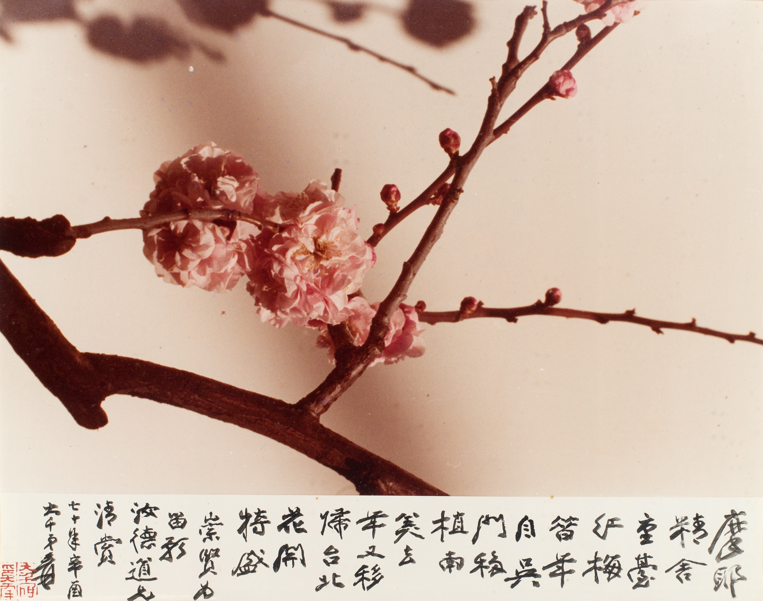 摩耶精舍重臺紅梅,昔年自吳門植南美,去年又移歸台北,花開特盛,崇賢為留影,汝德道兄清賞。七十年辛酉大千弟爰。